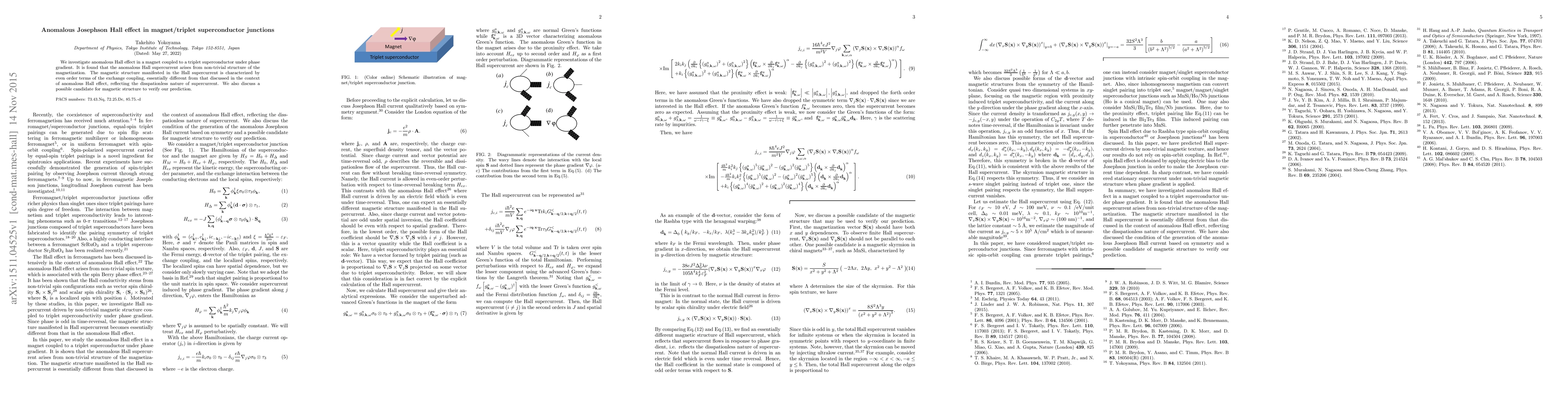 Summary: This paper explores the anomalous Hall effect in magnet/triplet superconductor junctions, revealing that the anomalous Hall supercurrent originates from the non-trivial magnetization structure, characterized by even order terms of exchange coupling, distinct from conventional anomalous Hall effects, and proposes a potential magnetic structure to verify these findings.