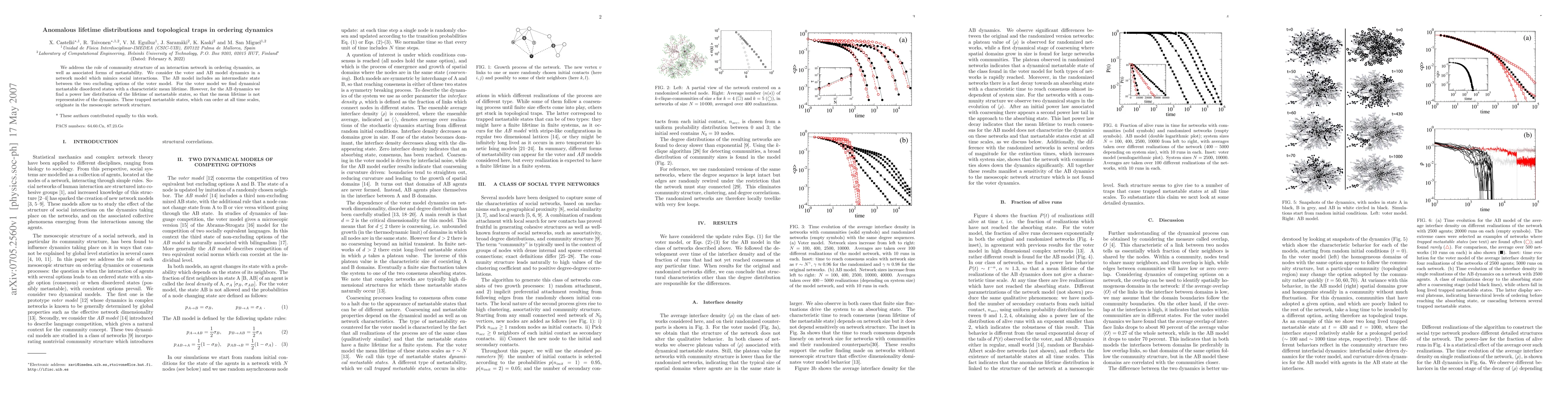 This paper investigates the impact of community structure in interaction networks on ordering dynamics, specifically in the voter and AB models. It reveals that while the voter model exhibits metastable disordered states with a characteristic mean lifetime, the AB model shows a power law distribution of metastable state lifetimes, indicating anomalous dynamics originating from the network's mesoscopic structure.