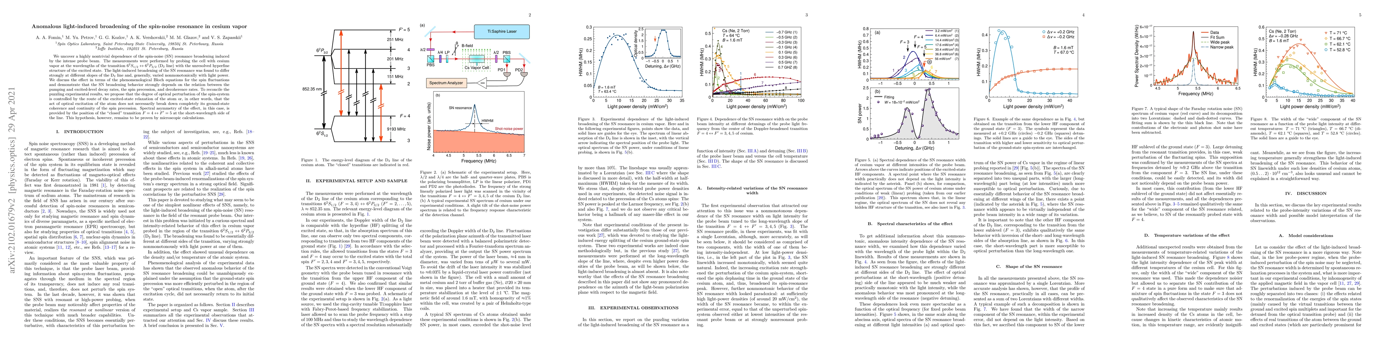 We uncover a highly nontrivial dependence of the spin-noise (SN) resonance broadening induced by the intense probe beam. The measurements were performed by probing the cell with cesium vapor at the wavelengths of the transition ${6}^2S_{1/2} \leftrightarrow {6}^2P_{3/2}$ ($\mathrm{D}_2$ line) with the unresolved hyperfine structure of the excited state. The light-induced broadening of the SN resonance was found to differ strongly at different slopes of the $\mathrm{D}_2$ line and, generally, varied nonmonotonically with light power. We discuss the effect in terms of the phenomenological Bloch equations for the spin fluctuations and demonstrate that the SN broadening behavior strongly depends on the relation between the pumping and excited-level decay rates, the spin precession, and decoherence rates. To reconcile the puzzling experimental results, we propose that the degree of optical perturbation of the spin-system is controlled by the route of the excited-state relaxation of the atom or, in other words, that the act of optical excitation of the atom does not necessarily break down completely its ground-state coherence and continuity of the spin precession. Spectral asymmetry of the effect, in this case, is provided by the position of the "closed" transition $F = 4 \leftrightarrow F' = 5$ at the short-wavelength side of the line. This hypothesis, however, remains to be proven by microscopic calculations.
