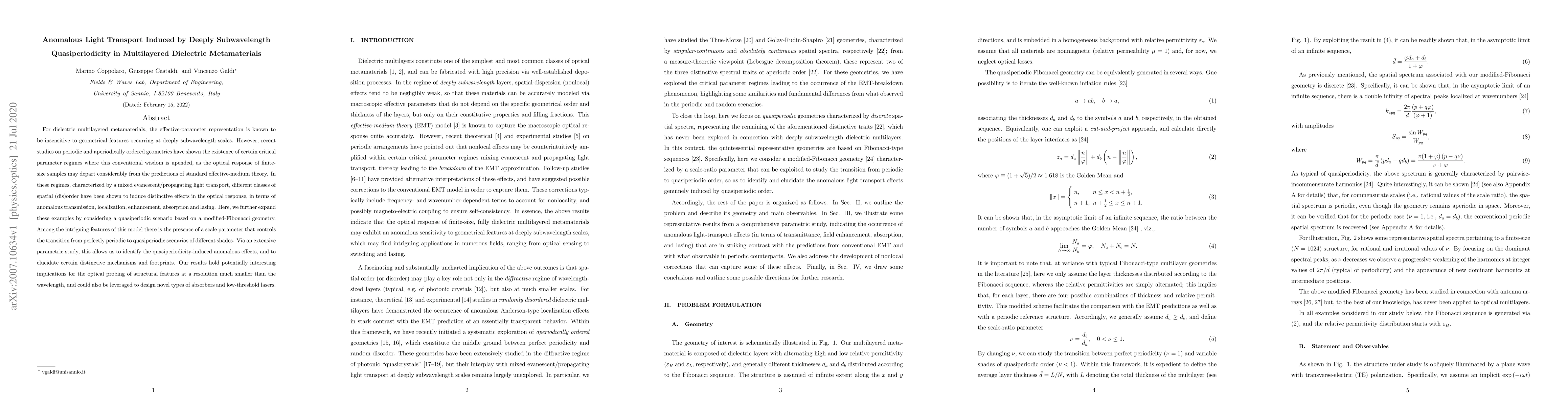 This paper investigates the anomalous light transport in dielectric multilayered metamaterials with quasiperiodic structures, revealing that quasiperiodicity can induce unique optical effects such as enhanced transmission and absorption, challenging conventional effective-medium theory. The study identifies mechanisms behind these effects and suggests applications for high-resolution optical probing and novel absorber/laser designs.