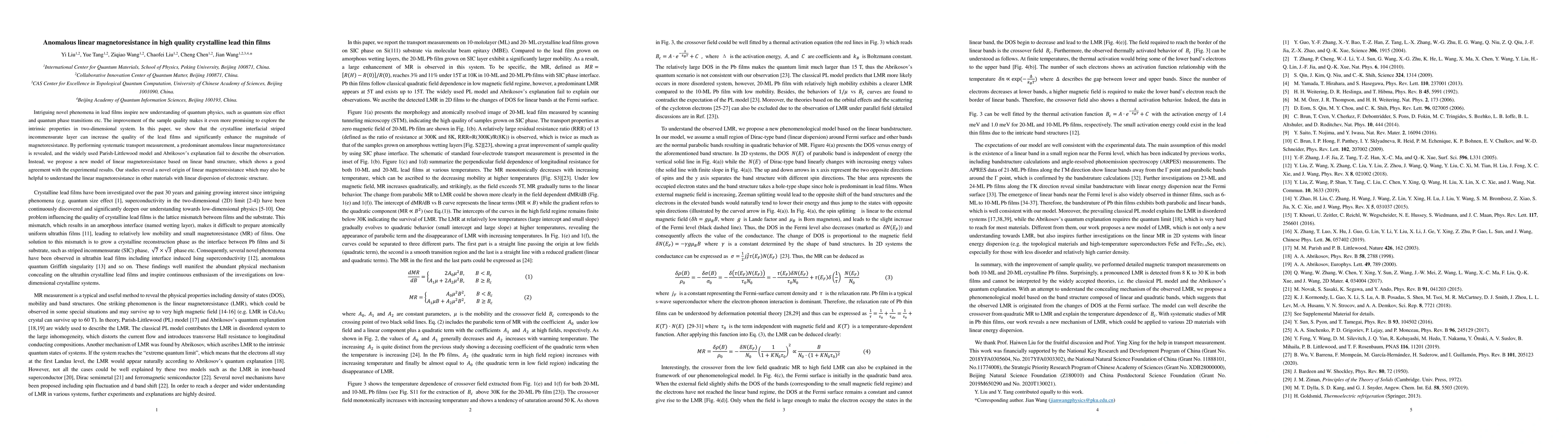 Intriguing novel phenomena in lead films inspire new understanding of quantum physics, such as quantum size effect and quantum phase transitions etc. The improvement of the sample quality makes it even more promising to explore the intrinsic properties in two-dimensional system. In this paper, we show that the crystalline interfacial striped incommensurate layer can increase the quality of the lead films and significantly enhance the magnitude of magnetoresistance. By performing systematic transport measurement, a predominant anomalous linear magnetoresistance is revealed, and the widely used Parish-Littlewood model and Abrikosov's explanation fail to describe the observation. Instead, we propose a new model of linear magnetoresistance based on linear band structure, which shows a good agreement with the experimental results. Our studies reveal a novel origin of linear magnetoresistance which may also be helpful to understand the linear magnetoresistance in other materials with linear dispersion of electronic structure.