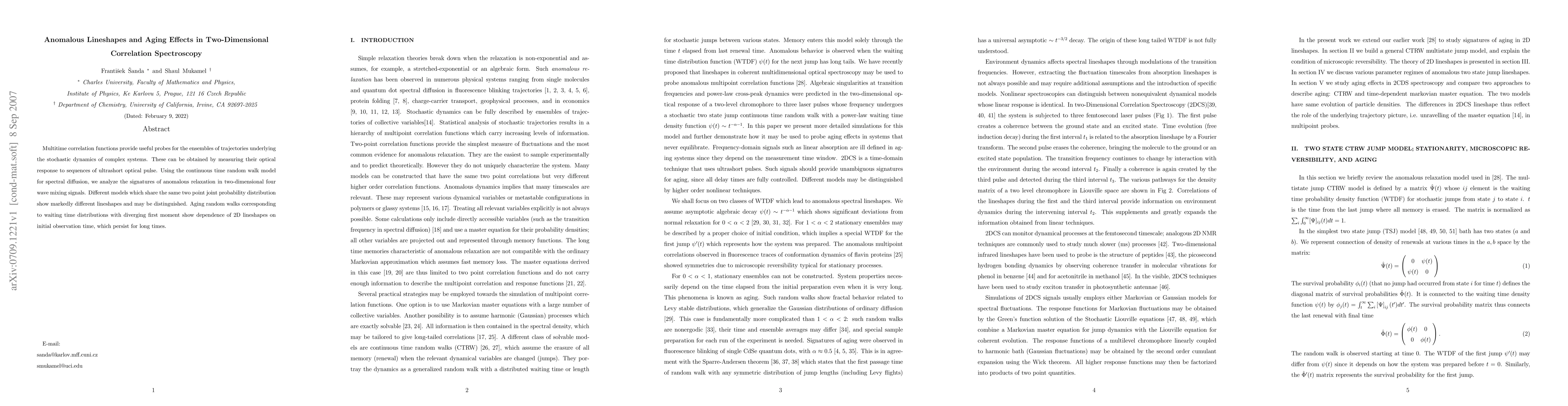 Multitime correlation functions provide useful probes for the ensembles of trajectories underlying the stochastic dynamics of complex systems. These can be obtained by measuring their optical response to sequences of ultrashort optical pulse. Using the continuous time random walk model for spectral diffusion, we analyze the signatures of anomalous relaxation in two-dimensional four wave mixing signals. Different models which share the same two point joint probability distribution show markedly different lineshapes and may be distinguished. Aging random walks corresponding to waiting time distributions with diverging first moment show dependence of 2D lineshapes on initial observation time, which persist for long times.