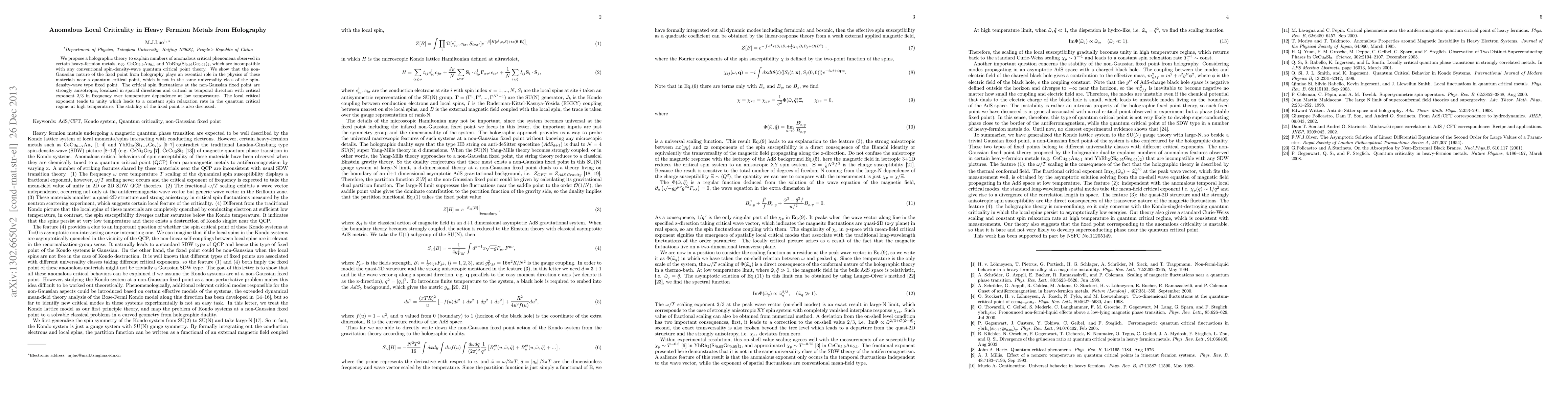 We propose a holographic theory to explain numbers of anomalous critical phenomena observed in certain heavy-fermion metals, e.g. $\mathrm{CeCu_{5.9}Au_{0.1}}$ and $\mathrm{YbRh_{2}(Si_{0.95}Ge_{0.05}})_{2}$, which are incompatible with any conventional spin-density-wave quantum critical point theory. We show that the non-Gaussian nature of the fixed point from holography plays an essential role in the physics of these materials near a quantum critical point, which is not in the same universality class of the spin-density-wave type fixed point. The critical spin fluctuations at the non-Gaussian fixed point are strongly anisotropic, localized in spatial directions and critical in temporal direction with critical exponent 2/3 in frequency over temperature dependence at low temperature. The local critical exponent tends to unity which leads to a constant spin relaxation rate in the quantum critical regime at high temperature. The stability of the fixed point is also discussed.