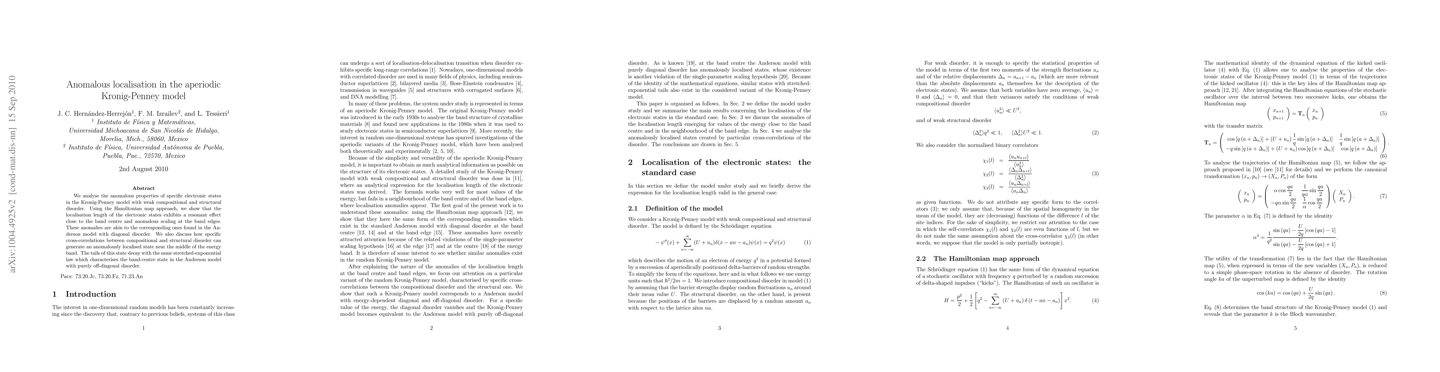 We analyse the anomalous properties of specific electronic states in the Kronig-Penney model with weak compositional and structural disorder. Using the Hamiltonian map approach, we show that the localisation length of the electronic states exhibits a resonant effect close to the band centre and anomalous scaling at the band edges. These anomalies are akin to the corresponding ones found in the Anderson model with diagonal disorder. We also discuss how specific cross-correlations between compositional and structural disorder can generate an anomalously localised state near the middle of the energy band. The tails of this state decay with the same stretched-exponential law which characterises the band-centre state in the Anderson model with purely off-diagonal disorder.