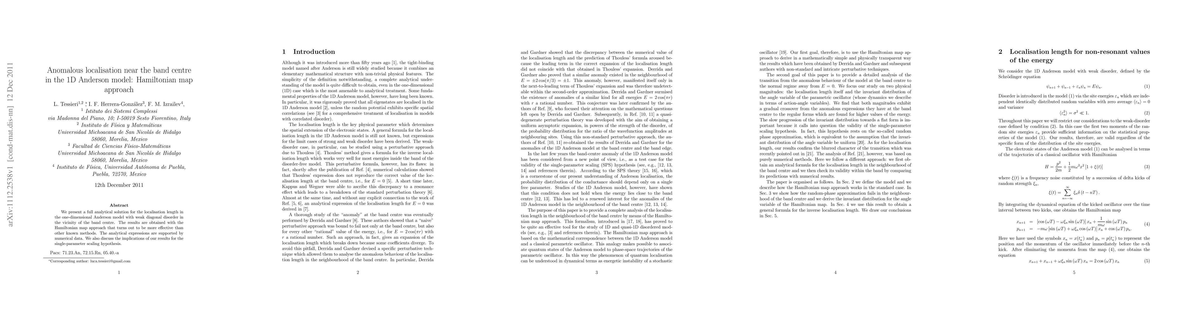 This paper provides an analytical solution for the localisation length in the 1D Anderson model near the band centre using the Hamiltonian map approach, demonstrating its effectiveness over other methods. The findings challenge the single-parameter scaling hypothesis.