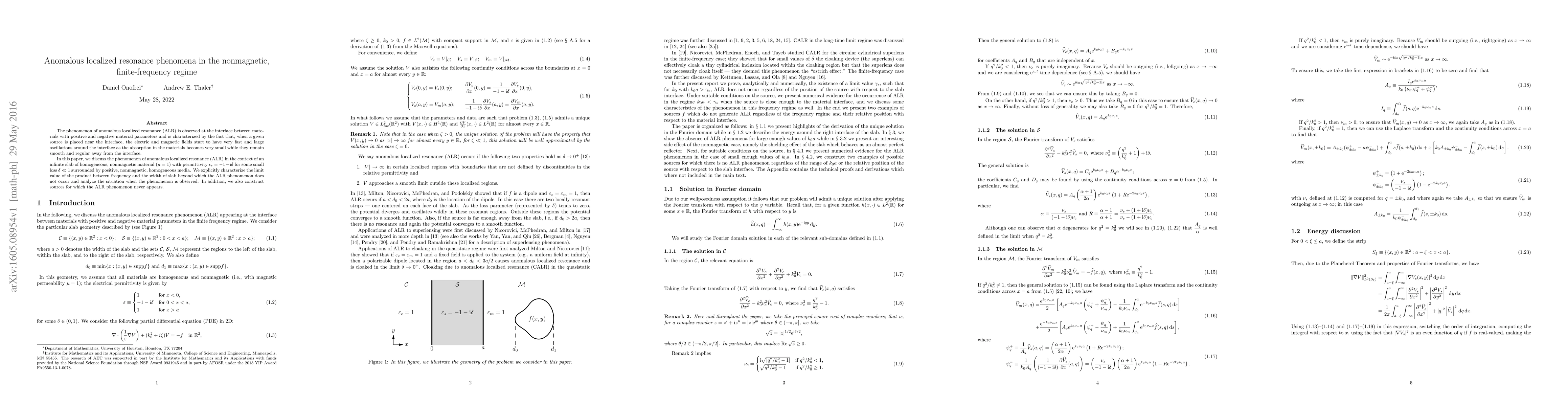 The phenomenon of anomalous localized resonance (ALR) is observed at the interface between materials with positive and negative material parameters and is characterized by the fact that, when a given source is placed near the interface, the electric and magnetic fields start to have very fast and large oscillations around the interface as the absorption in the materials becomes very small while they remain smooth and regular away from the interface. In this paper, we discuss the phenomenon of anomalous localized resonance (ALR) in the context of an infinite slab of homogeneous, nonmagnetic material ($\mu=1$) with permittivity $\epsilon_s=-1-\mathrm{i}\delta$ for some small loss $\delta \ll 1$ surrounded by positive, nonmagnetic, homogeneous media. We explicitly characterize the limit value of the product between frequency and the width of slab beyond which the ALR phenomenon does not occur and analyze the situation when the phenomenon is observed. In addition, we also construct sources for which the ALR phenomenon never appears.