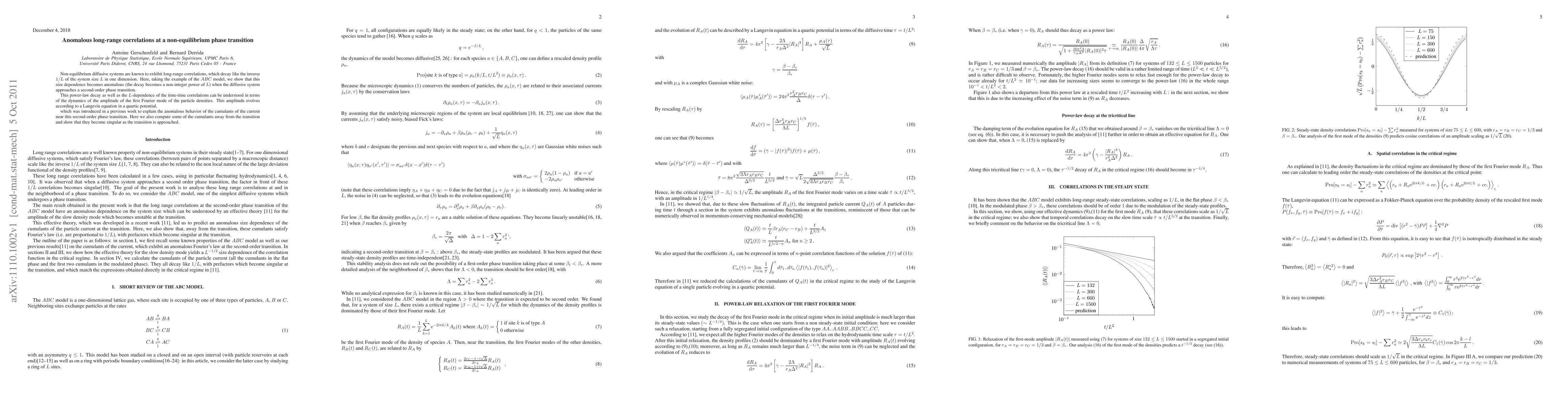 This paper investigates anomalous long-range correlations in non-equilibrium diffusive systems, specifically the ABC model, showing that near a second-order phase transition, the decay of correlations deviates from the typical 1/L behavior, exhibiting a non-integer power-law decay. The study links this behavior to the dynamics of the first Fourier mode amplitude, governed by a Langevin equation in a quartic potential.