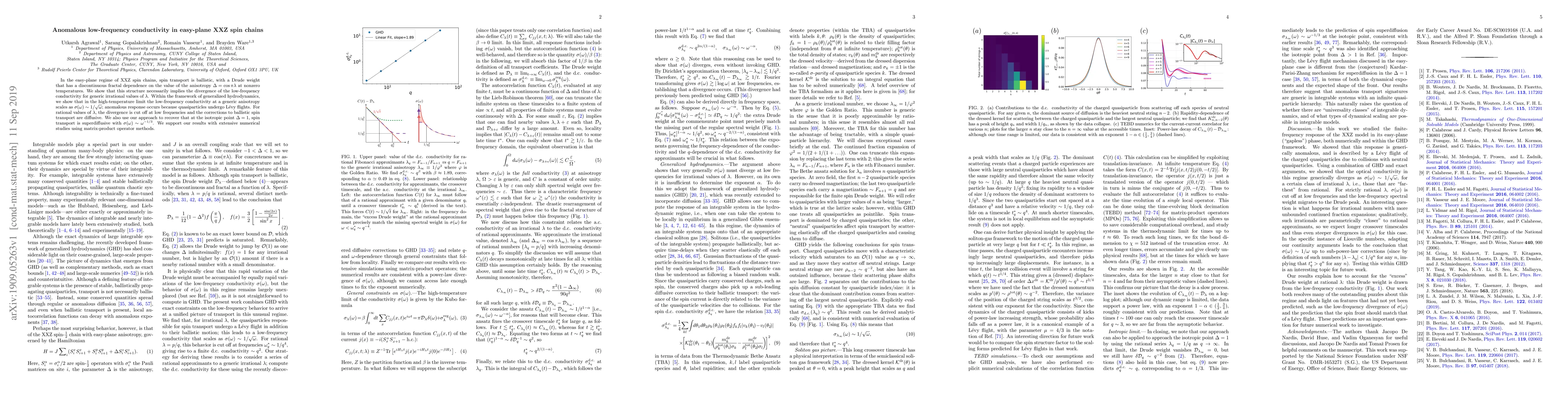 This paper investigates the anomalous low-frequency conductivity in easy-plane XXZ spin chains, revealing that it diverges for generic irrational anisotropy values due to quasiparticles undergoing Lévy flights. For rational values, the divergence is cut off, and transport becomes diffusive.
