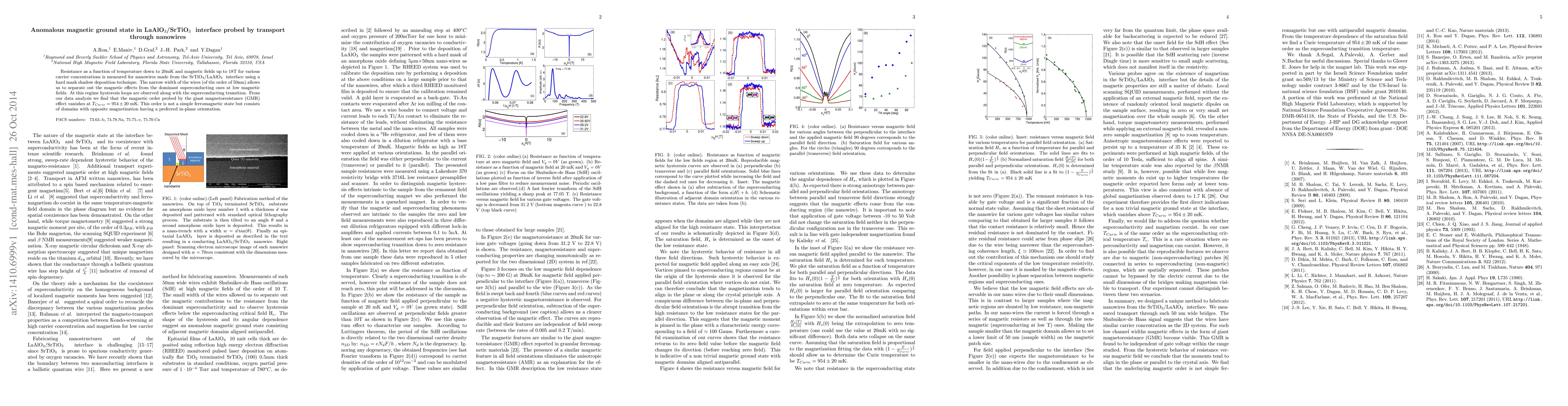 This study measures transport properties in SrTiO3/LaAlO3 interface nanowires, revealing anomalous magnetic ground states at low temperatures and magnetic fields. The nanowires exhibit hysteresis loops and a complex magnetic order that vanishes at TCurie = 954 mK, indicating a non-simple ferromagnetic state with in-plane oriented domains.