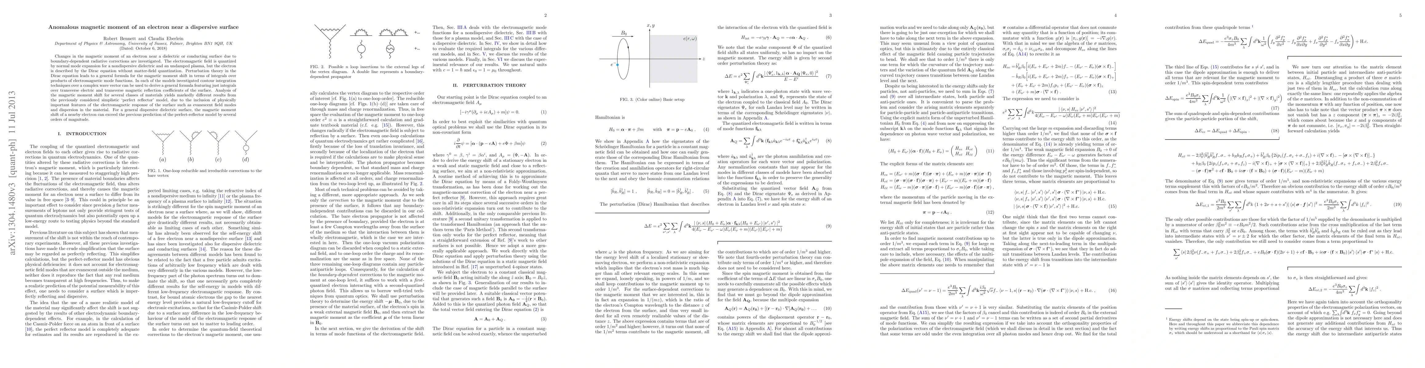 This paper investigates the anomalous magnetic moment of an electron near a dispersive surface, revealing significant shifts due to boundary-dependent radiative corrections. The study employs perturbation theory in the Dirac equation and contour integration techniques to derive formulas that account for material dispersion and evanescent field modes, leading to predictions that exceed those from the simplistic 'perfect reflector' model.