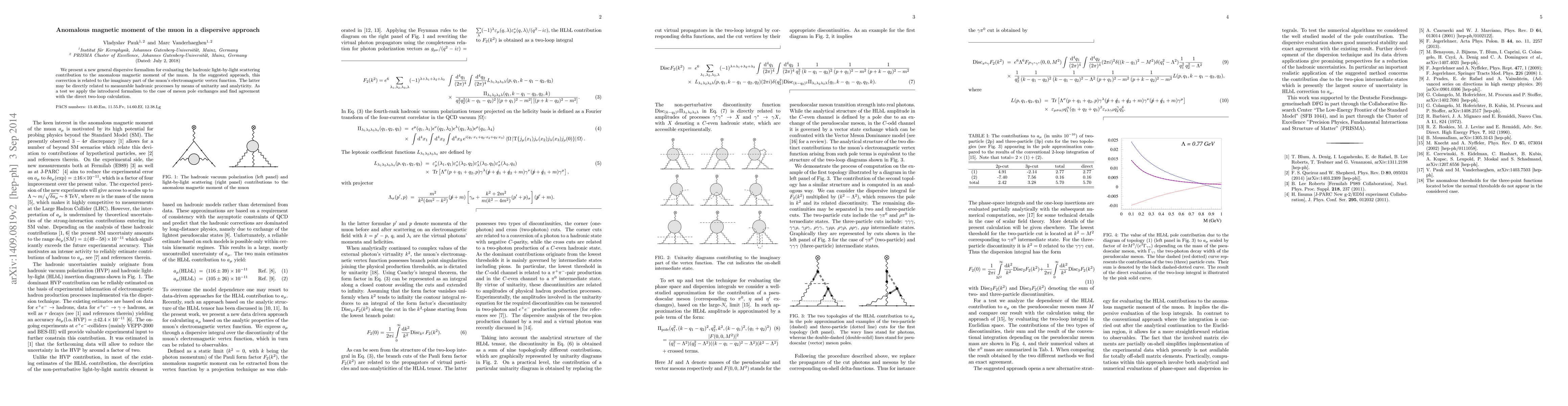 This paper introduces a new dispersive formalism to evaluate the hadronic light-by-light scattering contribution to the muon's anomalous magnetic moment, linking it to the imaginary part of the muon's electromagnetic vertex function. The approach is tested against meson pole exchanges, showing agreement with direct two-loop calculations.