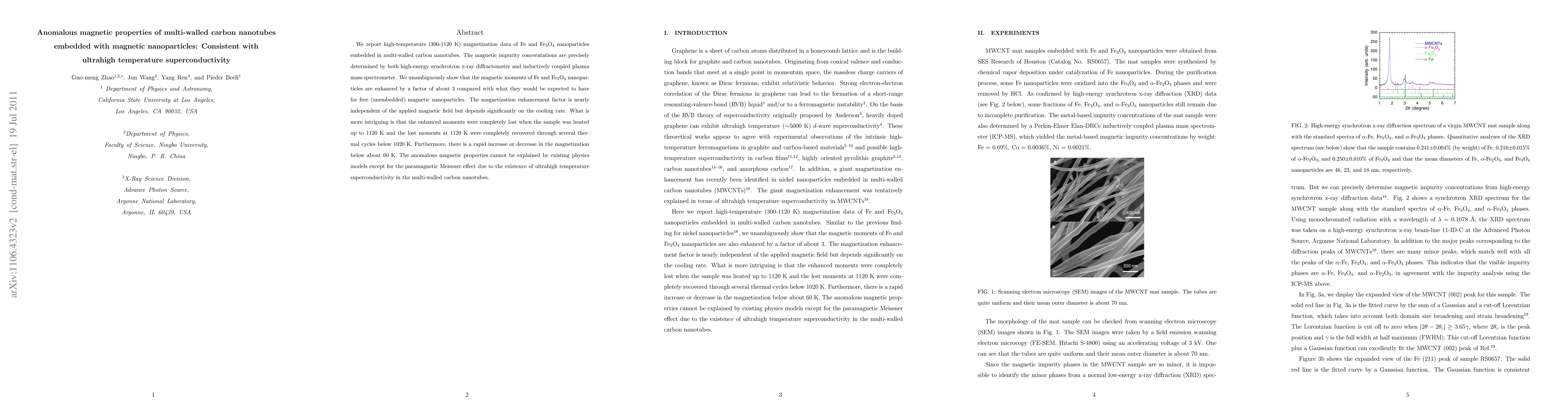 This study reveals that Fe and Fe3O4 nanoparticles embedded in multi-walled carbon nanotubes exhibit enhanced magnetic moments by a factor of about 3, with the enhancement being temperature-dependent and reversible. The findings suggest the presence of ultrahigh temperature superconductivity, as the observed magnetic anomalies cannot be explained by conventional physics models.