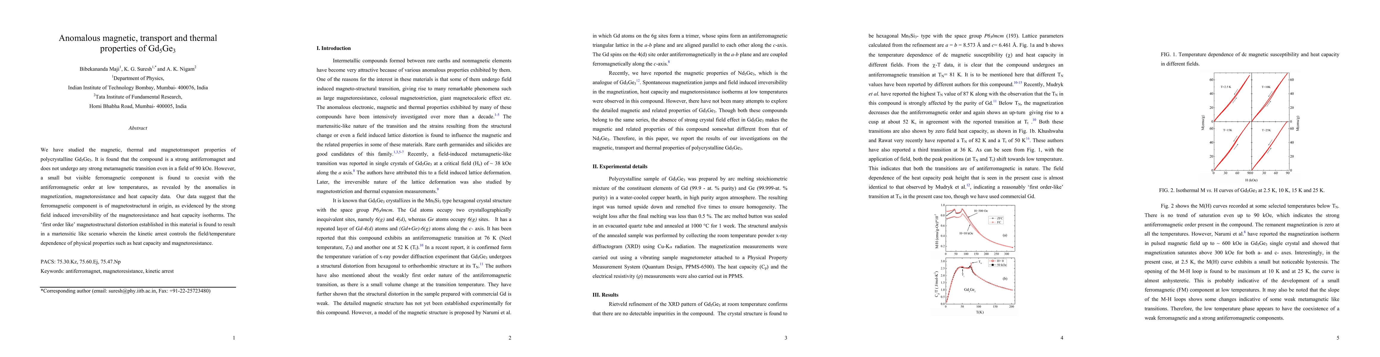 We have studied the magnetic, thermal and magnetotransport properties of polycrystalline Gd5Ge3. It is found that the compound is a strong antiferromagnet and does not undergo any strong metamagnetic transition even in a field of 90 kOe. However, a small but visible ferromagnetic component is found to coexist with the antiferromagnetic order at low temperatures, as revealed by the anomalies in magnetization, magnetoresistance and heat capacity data. Our data suggest that the ferromagnetic component is of magnetostructural in origin, as evidenced by the strong field induced irreversibility of the magnetoresistance and heat capacity isotherms. The first order like magnetostructural distortion established in this material is found to result in a martensitic like scenario wherein the kinetic arrest controls the field/temperature dependence of physical properties such as heat capacity and magnetoresistance.