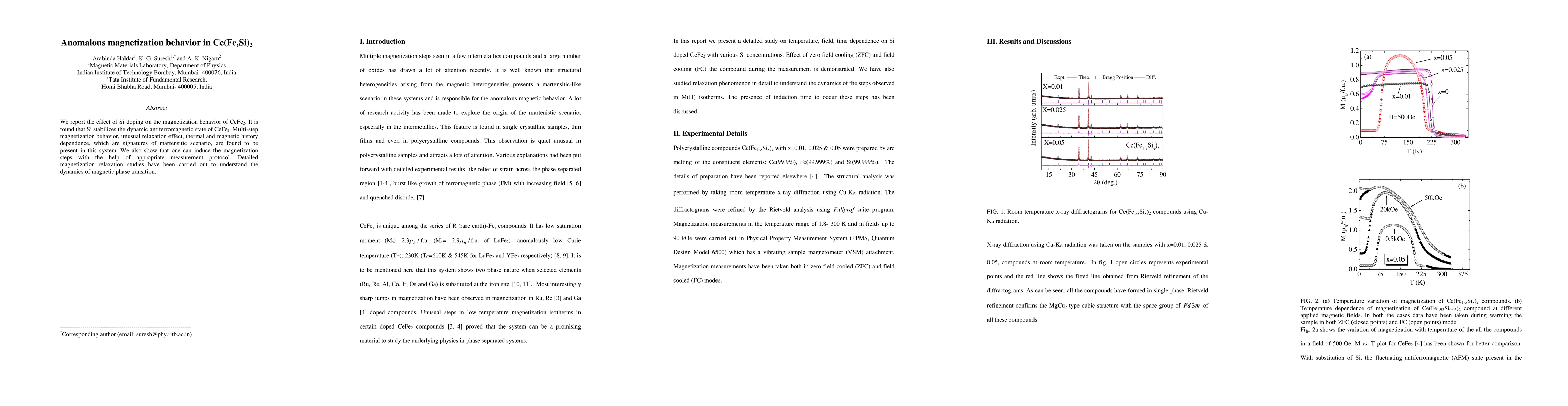 We report the effect of Si doping on the magnetization behavior of CeFe2. It is found that Si stabilizes the dynamic antiferromagnetic state of CeFe2. Multi-step magnetization behavior, unusual relaxation effect, thermal and magnetic history dependence, which are signatures of martensitic scenario, are found to be present in this system. We also show that one can induce the magnetization steps with the help of appropriate measurement protocol. Detailed magnetization relaxation studies have been carried out to understand the dynamics of magnetic phase transition.