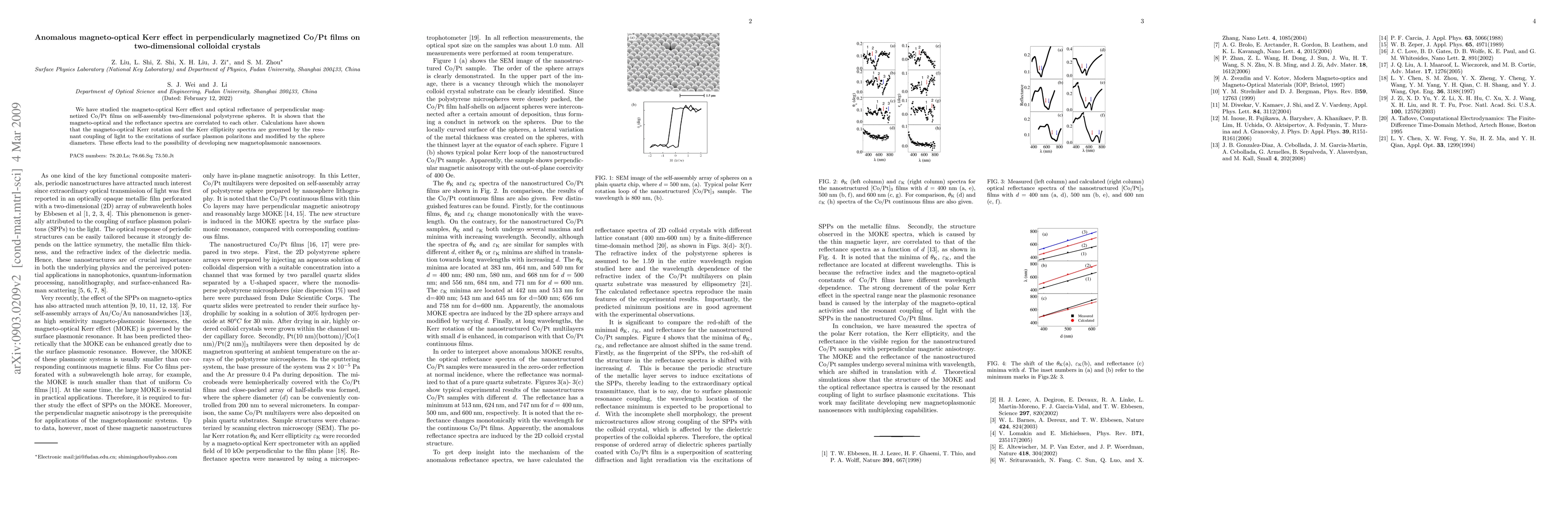 We have studied the magneto-optical Kerr effect and optical reflectance of perpendicular magnetized Co/Pt films on self-assembly two-dimensional polystyrene spheres. It is shown that the magneto-optical and the reflectance spectra are correlated to each other. Calculations have shown that the magneto-optical Kerr rotation and the Kerr ellipticity spectra are governed by the resonant coupling of light to the excitations of surface plasmon polaritons and modified by the sphere diameters. These effects lead to the possibility of developing new magnetoplasmonic nanosensors.