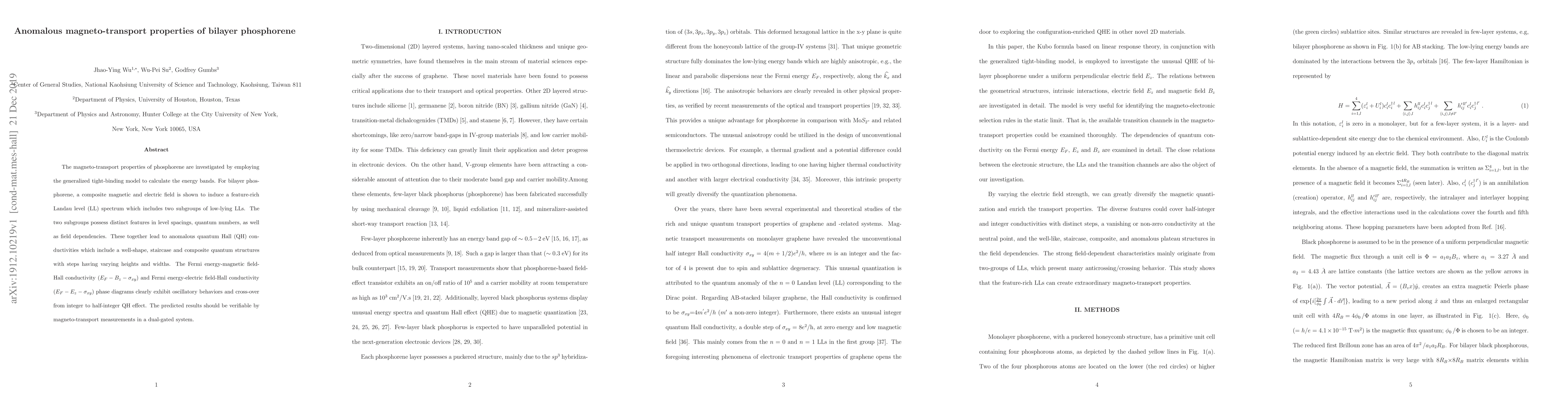 This paper investigates the magneto-transport properties of bilayer phosphorene using a generalized tight-binding model, revealing a complex Landau level spectrum and anomalous quantum Hall effects with varying step heights and widths in phase diagrams. The findings suggest potential for verification through magneto-transport measurements in a dual-gated setup.