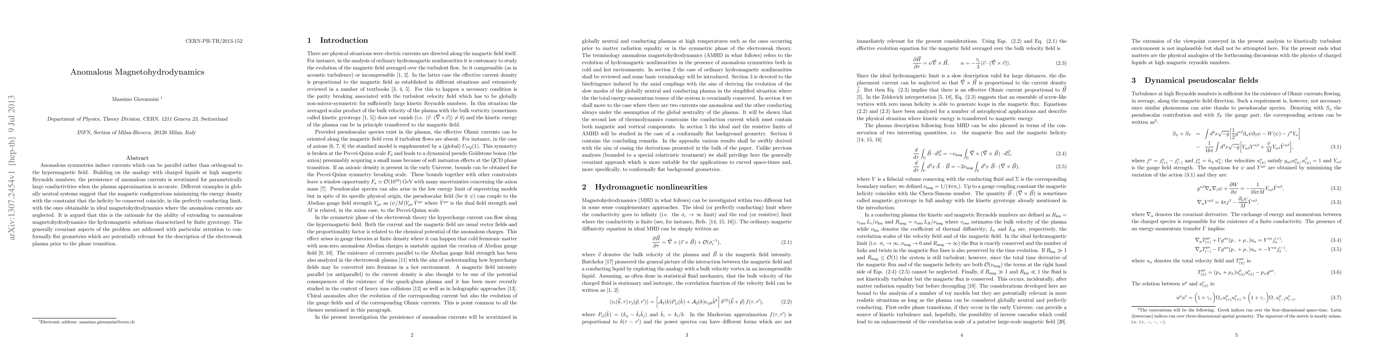 Anomalous symmetries induce currents which can be parallel rather than orthogonal to the hypermagnetic field. Building on the analogy with charged liquids at high magnetic Reynolds numbers, the persistence of anomalous currents is scrutinized for parametrically large conductivities when the plasma approximation is accurate. Different examples in globally neutral systems suggest that the magnetic configurations minimizing the energy density with the constraint that the helicity be conserved coincide, in the perfectly conducting limit, with the ones obtainable in ideal magnetohydrodynamics where the anomalous currents are neglected. It is argued that this is the rationale for the ability of extending to anomalous magnetohydrodynamics the hydromagnetic solutions characterized by finite gyrotropy. The generally covariant aspects of the problem are addressed with particular attention to conformally flat geometries which are potentially relevant for the description of the electroweak plasma prior to the phase transition.
