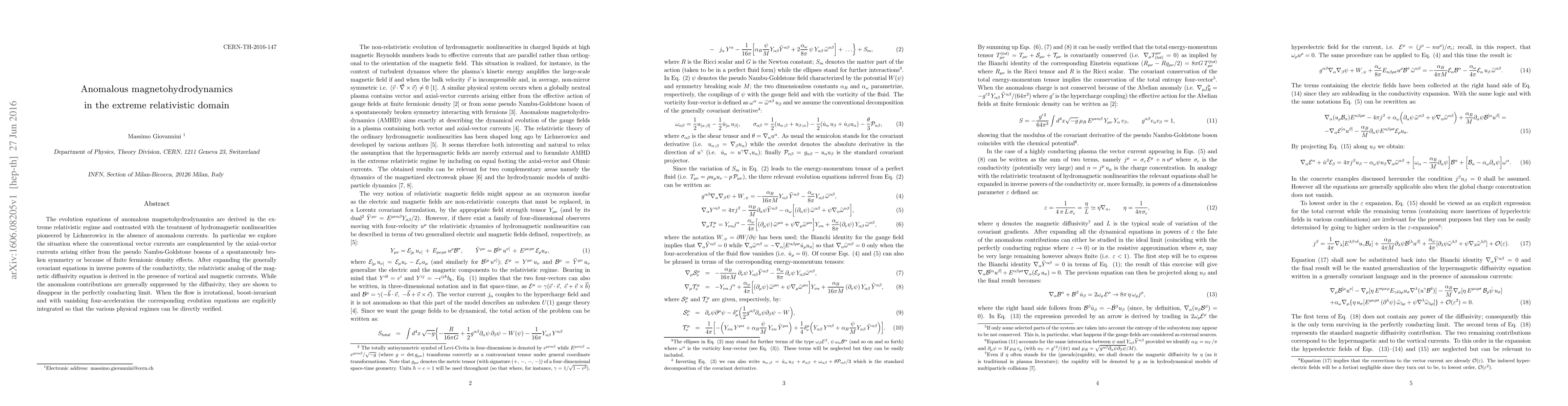 The evolution equations of anomalous magnetohydrodynamics are derived in the extreme relativistic regime and contrasted with the treatment of hydromagnetic nonlinearities pioneered by Lichnerowicz in the absence of anomalous currents. In particular we explore the situation where the conventional vector currents are complemented by the axial-vector currents arising either from the pseudo Nambu-Goldstone bosons of a spontaneously broken symmetry or because of finite fermionic density effects. After expanding the generally covariant equations in inverse powers of the conductivity, the relativistic analog of the magnetic diffusivity equation is derived in the presence of vortical and magnetic currents. While the anomalous contributions are generally suppressed by the diffusivity, they are shown to disappear in the perfectly conducting limit. When the flow is irrotational, boost-invariant and with vanishing four-acceleration the corresponding evolution equations are explicitly integrated so that the various physical regimes can be directly verified.
