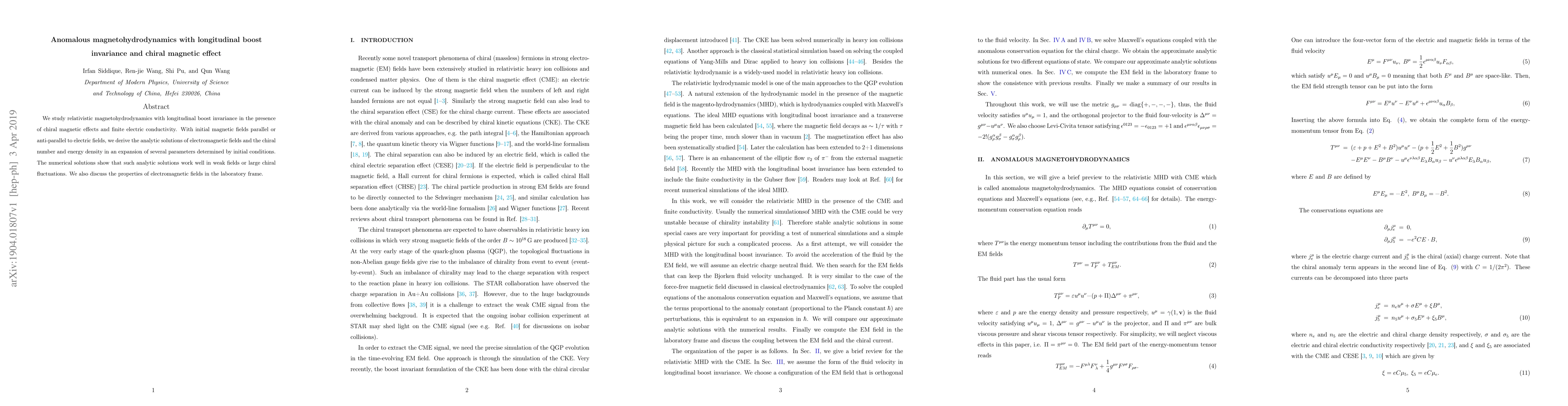 This paper investigates relativistic magnetohydrodynamics under longitudinal boost invariance, focusing on chiral magnetic effects and finite electric conductivity. It derives analytic solutions for electromagnetic fields and chiral number, demonstrating their accuracy in weak fields or large chiral fluctuations, and discusses electromagnetic field properties in the laboratory frame.