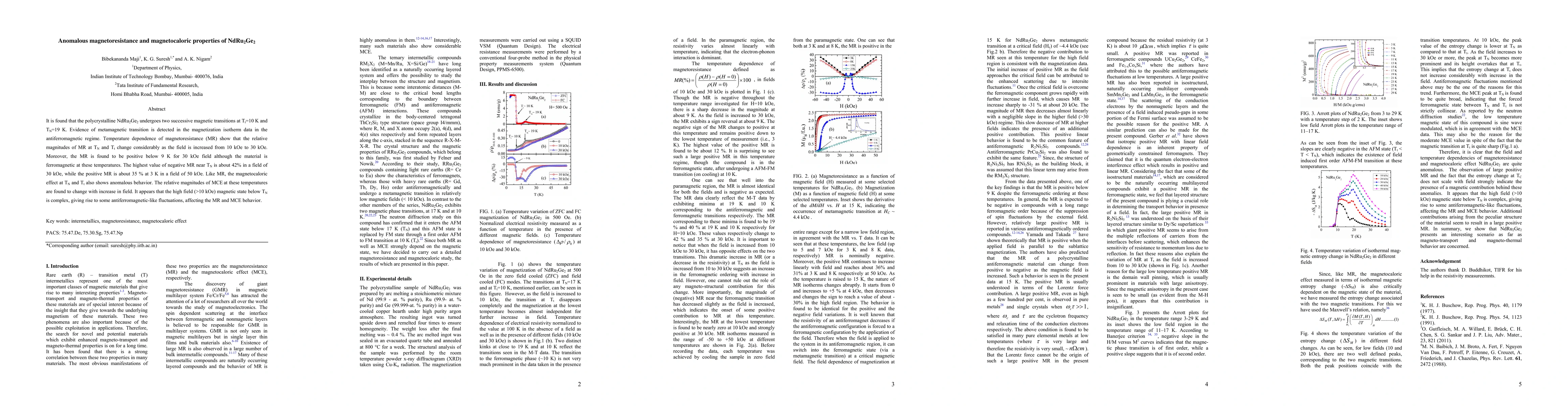 It is found that the polycrystalline NdRu2Ge2 undergoes two successive magnetic transitions at Tt=10 K and TN=19 K. Evidence of metamagnetic transition is detected in the magnetization isotherm data in the antiferromagnetic regime. Temperature dependence of magnetoresistance (MR) show that the relative magnitudes of MR at TN and Tt change considerably as the field is increased from 10 kOe to 30 kOe. Moreover, the MR is found to be positive below 9 K for 30 kOe field although the material is ferromagnetic at these temperatures. The highest value of negative MR near TN is about 42% in a field of 30 kOe, while the positive MR is about 35 % at 3 K in a field of 50 kOe. Like MR, the magnetocaloric effect at TN and Tt also shows anomalous behavior. The relative magnitudes of MCE at these temperatures are found to change with increase in field. It appears that the high field (>10 kOe) magnetic state below TN is complex, giving rise to some antiferromagnetic-like fluctuations, affecting the MR and MCE behavior.