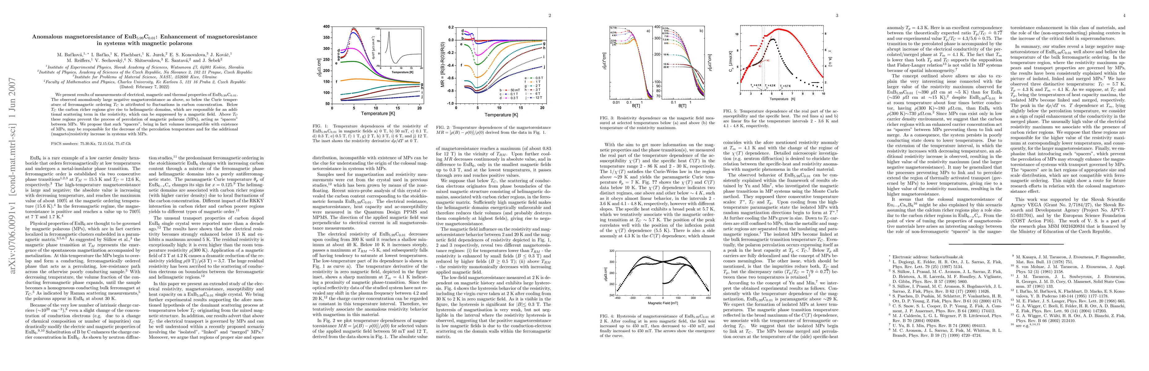 We present results of measurements of electrical, magnetic and thermal properties of EuB$_{5.99}$C$_{0.01}$. The observed anomalously large negative magnetoresistance as above, so below the Curie temperature of ferromagnetic ordering $T_C$ is attributed to fluctuations in carbon concentration. Below $T_C$ the carbon richer regions give rise to helimagnetic domains, which are responsible for an additional scattering term in the resistivity, which can be suppressed by a magnetic field. Above $T_C$ these regions prevent the process of percolation of magnetic polarons (MPs), acting as "spacers" between MPs. We propose that such "spacers", being in fact volumes incompatible with existence of MPs, may be responsible for the decrease of the percolation temperature and for the additional (magneto)resistivity increase in systems with MPs.