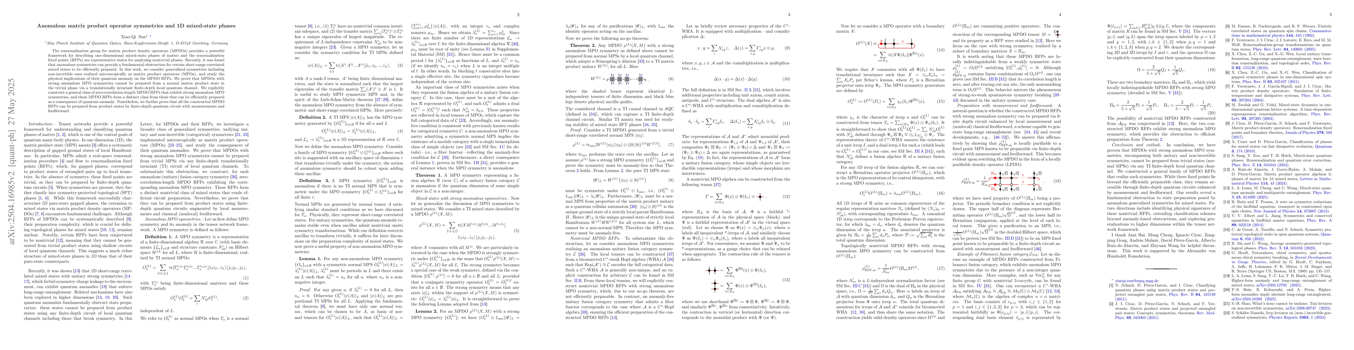 The paper presents a detailed analysis of anomalous matrix product operator symmetries and their impact on 1D mixed-state phases, proving preparation obstructions and constructing novel RFP classes via quantum circuits.