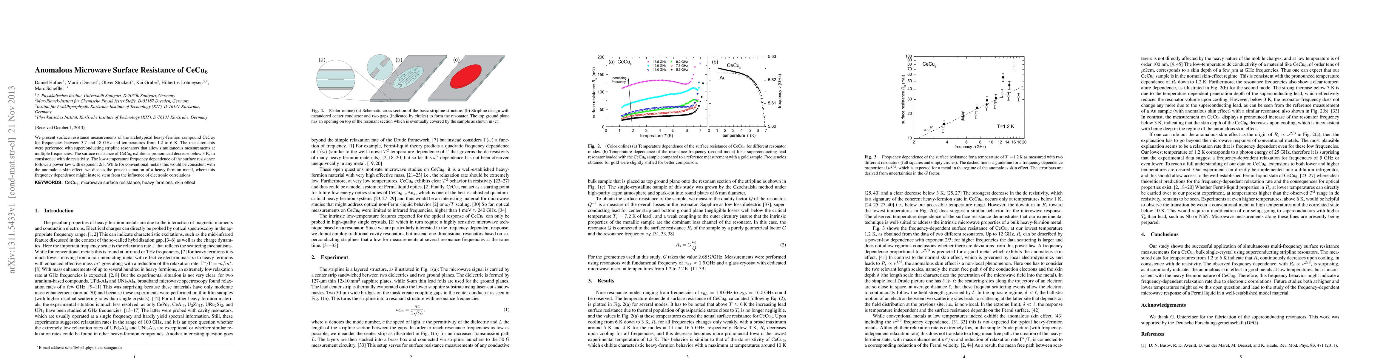 We present surface resistance measurements of the archetypical heavy-fermion compound CeCu6 for frequencies between 3.7 and 18 GHz and temperatures from 1.2 to 6 K. The measurements were performed with superconducting stripline resonators that allow simultaneous measurements at multiple frequencies. The surface resistance of CeCu6 exhibits a pronounced decrease below 3 K, in consistence with dc resistivity. The low-temperature frequency dependence of the surface resistance follows a power law with exponent 2/3. While for conventional metals this would be consistent with the anomalous skin effect, we discuss the present situation of a heavy-fermion metal, where this frequency dependence might instead stem from the influence of electronic correlations.