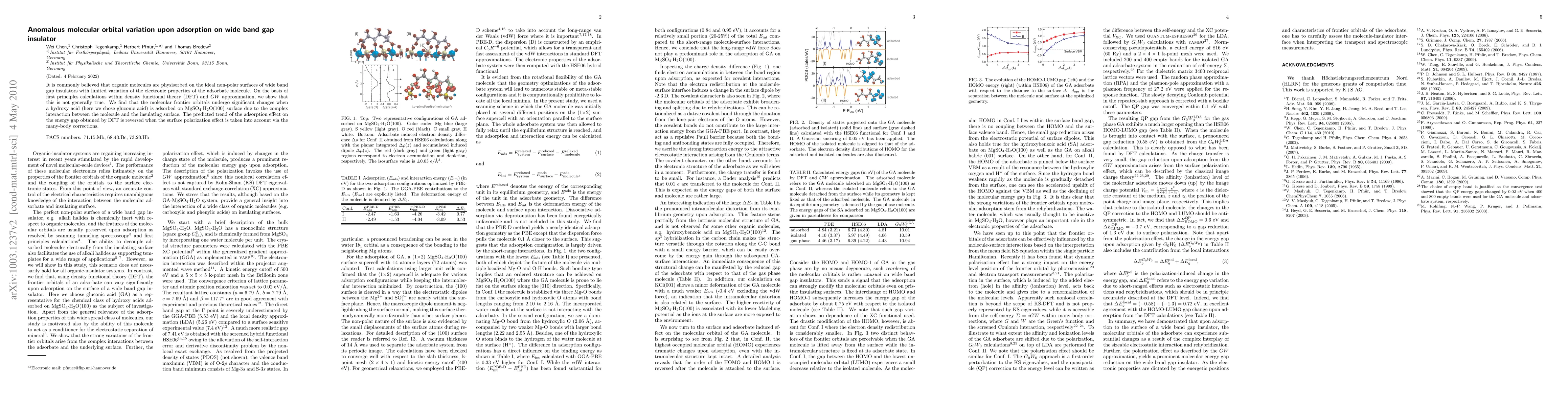 This study reveals significant changes in the molecular frontier orbitals of gluconic acid upon adsorption on a MgSO$_4$$\cdot$H$_2$O surface, challenging the notion of minimal electronic property variation in physisorbed organic molecules. The first principles calculations using DFT and $GW$ approximation show that the adsorption effect on the energy gap is reversed when considering surface polarization effects.