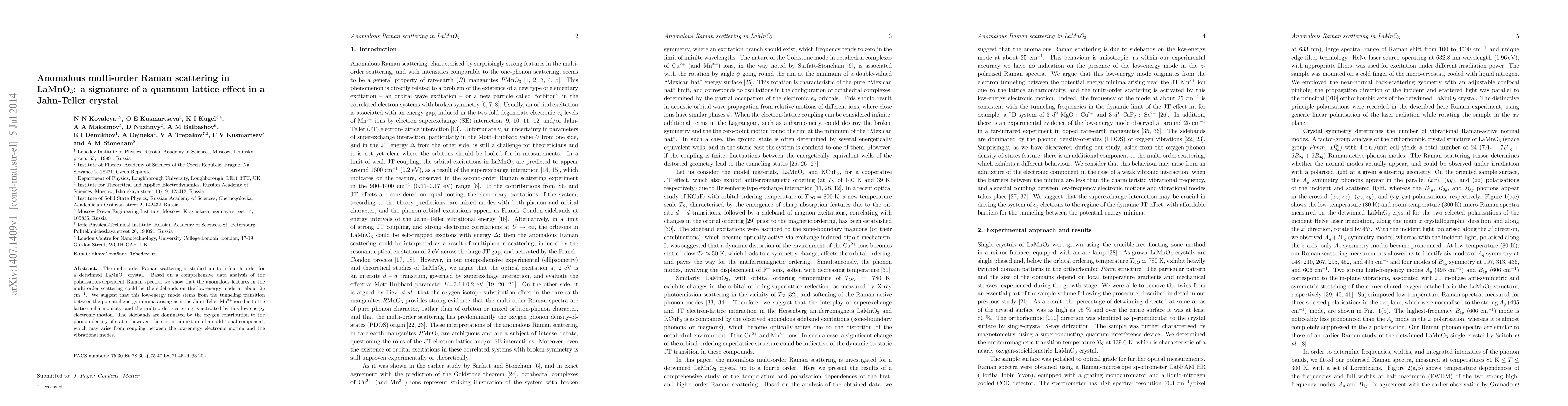 This study investigates multi-order Raman scattering in detwinned LaMnO_3, revealing anomalous features attributed to sidebands on a low-energy mode around 25 cm-1. The sidebands are linked to tunneling transitions near Jahn-Teller Mn3+ ions due to lattice anharmonicity, suggesting a quantum lattice effect.
