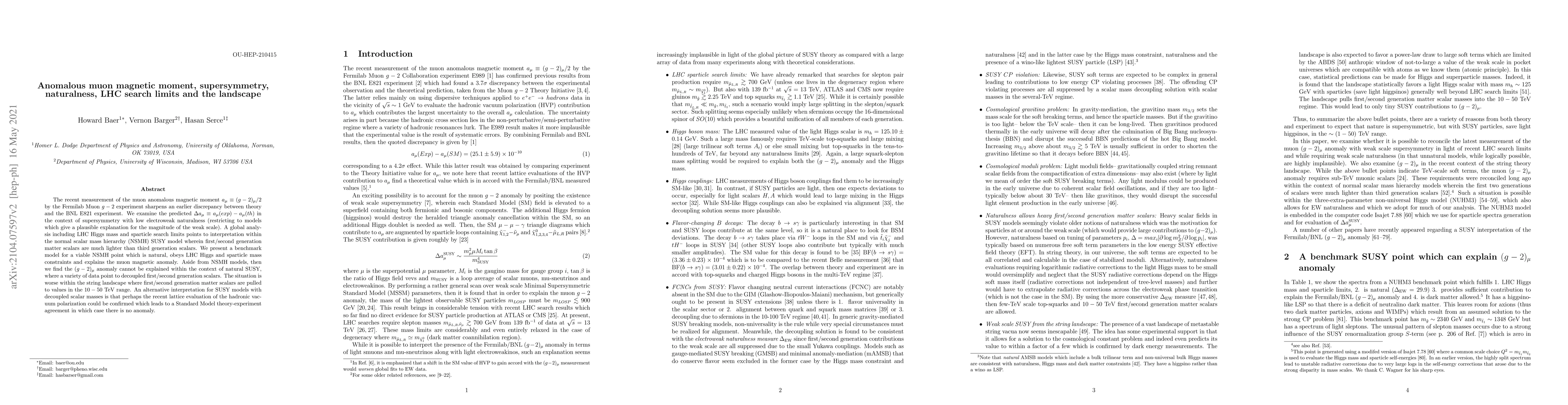 This paper investigates the muon anomalous magnetic moment discrepancy, focusing on supersymmetry models that explain it while maintaining naturalness. It finds that the normal scalar mass hierarchy SUSY model can address the anomaly, while natural SUSY and string landscape models struggle to do so, suggesting a potential resolution if the recent lattice evaluation of the hadronic vacuum polarization is confirmed.
