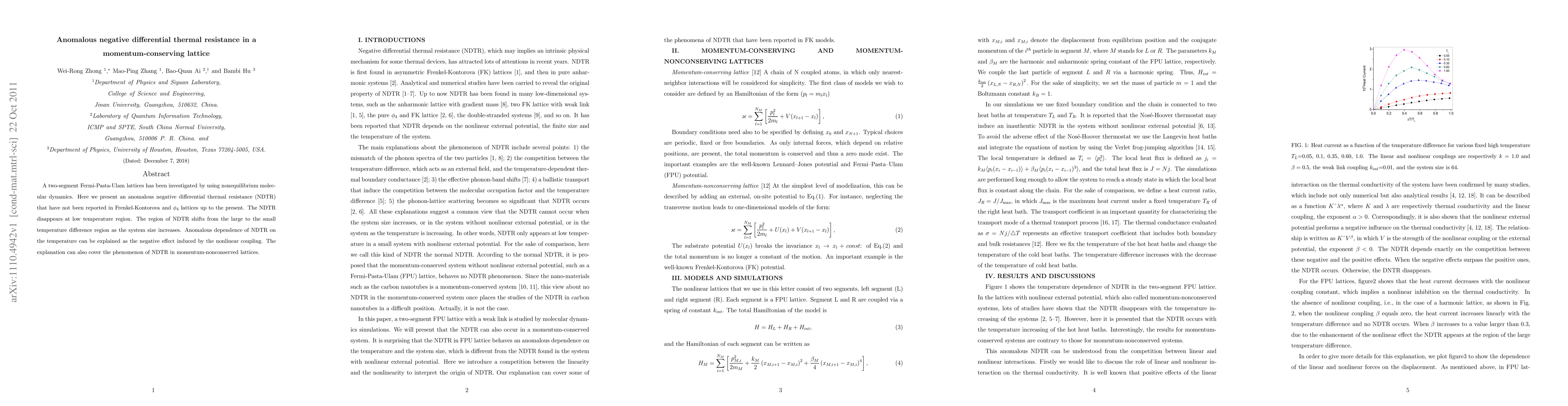 A two-segment Fermi-Pasta-Ulam lattices has been investigated by using nonequilibrium molecular dynamics. Here we present an anomalous negative differential thermal resistance (NDTR) that have not been reported in Frenkel-Kontorova and \phi_4 lattices up to the present. The NDTR disappears at low temperature region. The region of NDTR shifts from the large to the small temperature difference region as the system size increases. Anomalous dependence of NDTR on the temperature can be explained as the negative effect induced by the nonlinear coupling. The explanation can also cover the phenomenon of NDTR in momentum-nonconserved lattices.