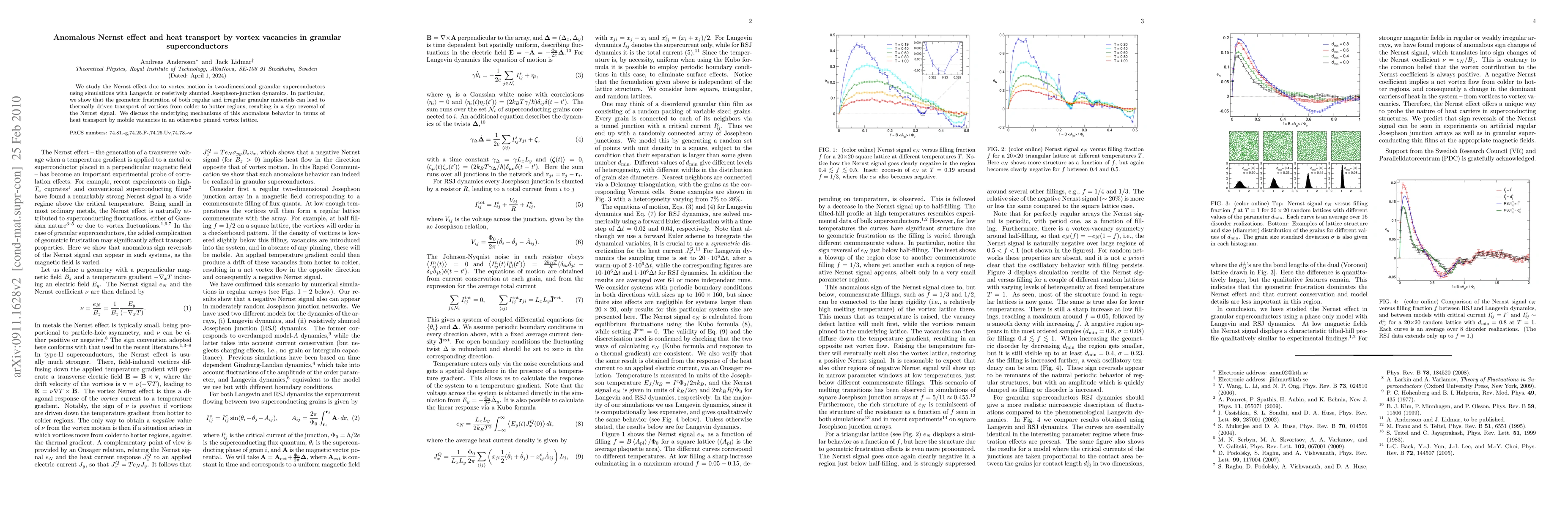 This paper investigates the anomalous Nernst effect in two-dimensional granular superconductors, demonstrating that geometric frustration can cause vortex motion to transport heat from colder to hotter regions, reversing the Nernst signal. The study attributes this behavior to heat transport by vortex vacancies in a pinned vortex lattice.