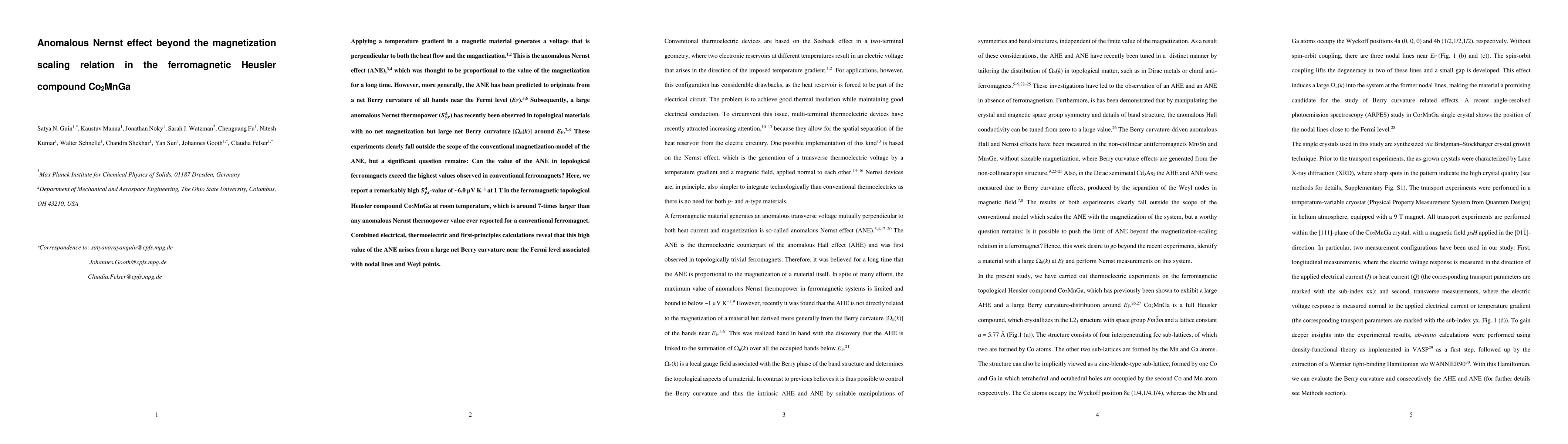 This paper reports a significantly high anomalous Nernst thermopower value in the ferromagnetic Heusler compound Co$_2$MnGa, exceeding previous values in conventional ferromagnets by a factor of 7. The study reveals that this effect is due to a large net Berry curvature near the Fermi level associated with nodal lines and Weyl points, challenging the conventional magnetization-based model of the anomalous Nernst effect.