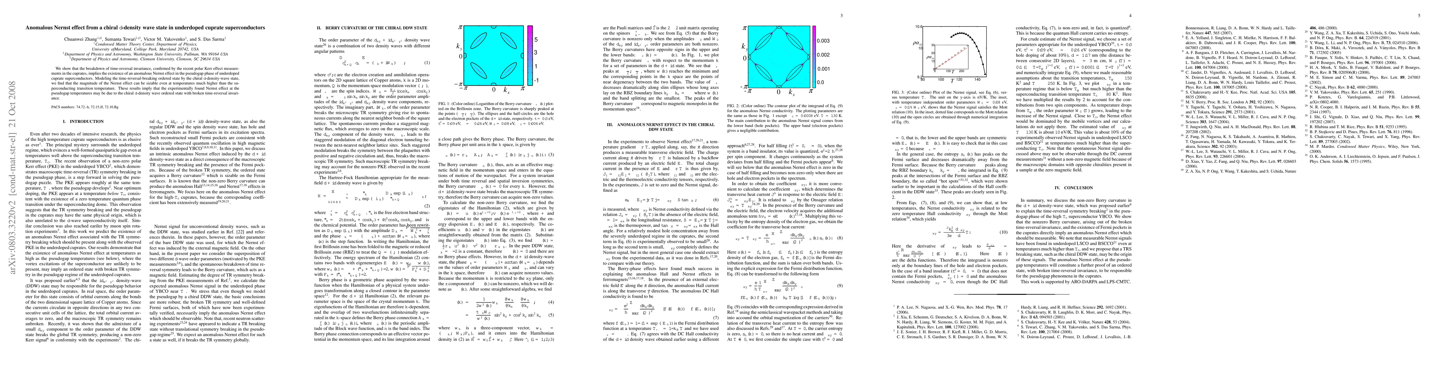 This paper demonstrates that the absence of time-reversal symmetry in underdoped cuprate superconductors leads to an anomalous Nernst effect in their pseudogap phase. The chiral d-density wave state is proposed as the underlying mechanism, suggesting that the sizable Nernst effect observed experimentally may arise from this time-reversal-breaking ordered state.