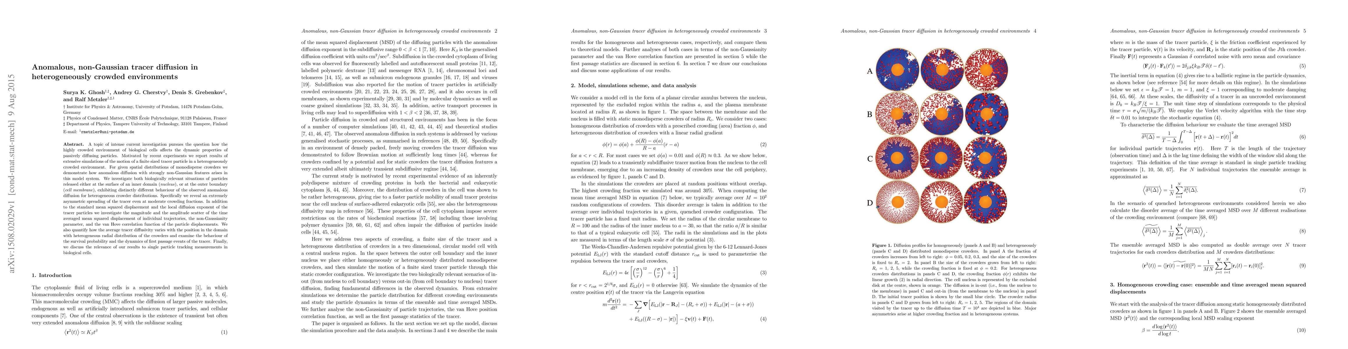 This paper investigates the anomalous, non-Gaussian diffusion of tracer particles in heterogeneously crowded cellular environments through extensive simulations. It reveals distinct, asymmetric diffusion behaviors depending on the initial release location within the cell, and discusses implications for single particle tracking in biological contexts.