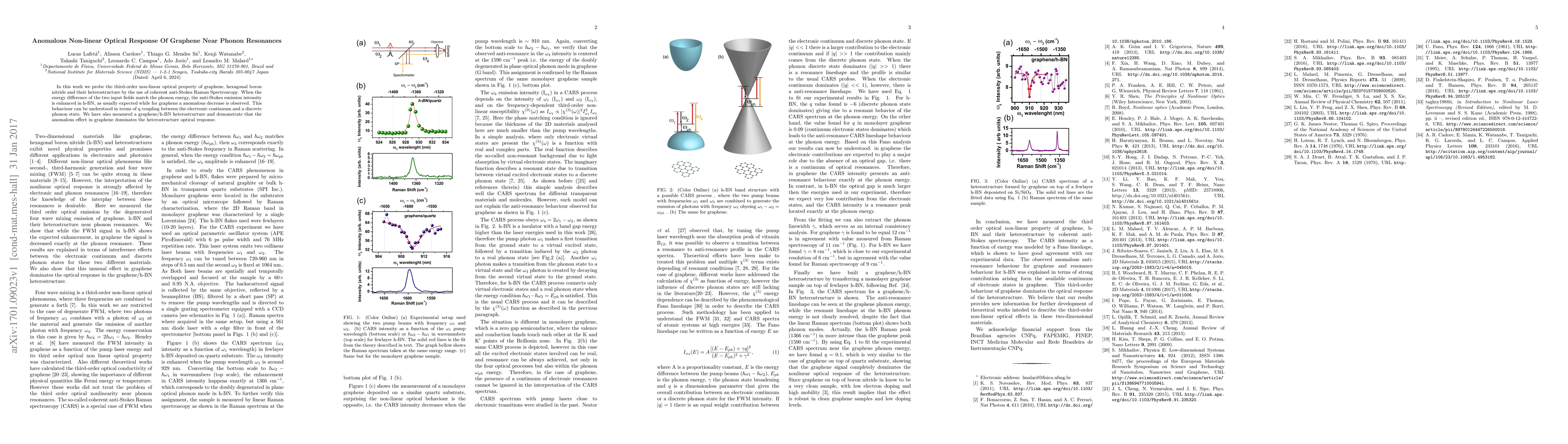 This study investigates the third-order non-linear optical properties of graphene, h-BN, and their heterostructure using coherent anti-Stokes Raman Spectroscopy. Anomalous non-linear optical responses in graphene near phonon resonances are observed, contrasting with the expected behavior in h-BN, due to q coupling between electronic and phonon states. The anomalous effect in graphene dominates the optical response in the heterostructure.