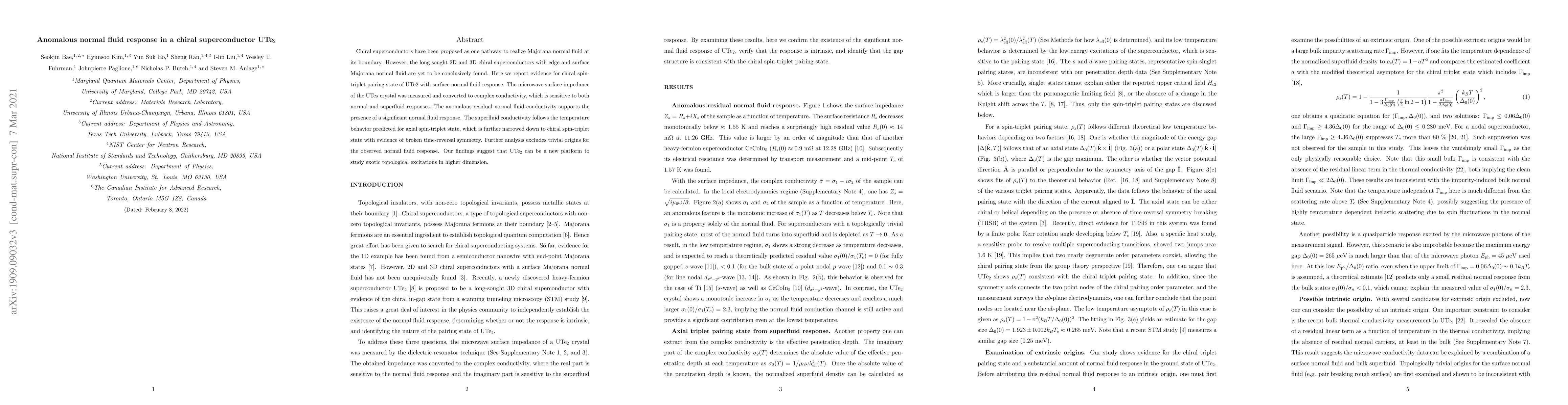 A chiral superconductor has been proposed as one pathway to realize topological quantum computation utilizing the predicted Majorana normal fluid at its boundary (i.e., a point, edge, or surface). The search for experimental realizations has led to the discovery of 1D chiral superconducting systems. However, the long-sought 2D and 3D chiral superconductors with edge and surface Majorana normal fluid are yet to be conclusively found. Here we report evidence for a chiral spin-triplet pairing state of UTe$_2$ with significant surface normal fluid response. The microwave surface impedance of the UTe$_2$ crystal was measured and converted to complex conductivity, which is sensitive to both normal and superfluid responses. The anomalous residual normal fluid conductivity in the zero temperature limit supports the presence of a significant normal fluid response. The superfluid conductivity follows the low temperature behavior predicted for the axial spin-triplet state, which is further narrowed down to the chiral spin-triplet state with evidence of broken time-reversal symmetry. The temperature dependence of the superfluid conductivity also reveals a low bulk impurity scattering rate and low frequency-to-energy-gap ratio, implying that the observed normal fluid response does not have a trivial origin. Our findings suggest that UTe$_2$ can be a new platform to study exotic topological excitations in higher dimension, and may play the role of a versatile 3D building block in the future era of topological quantum computation.