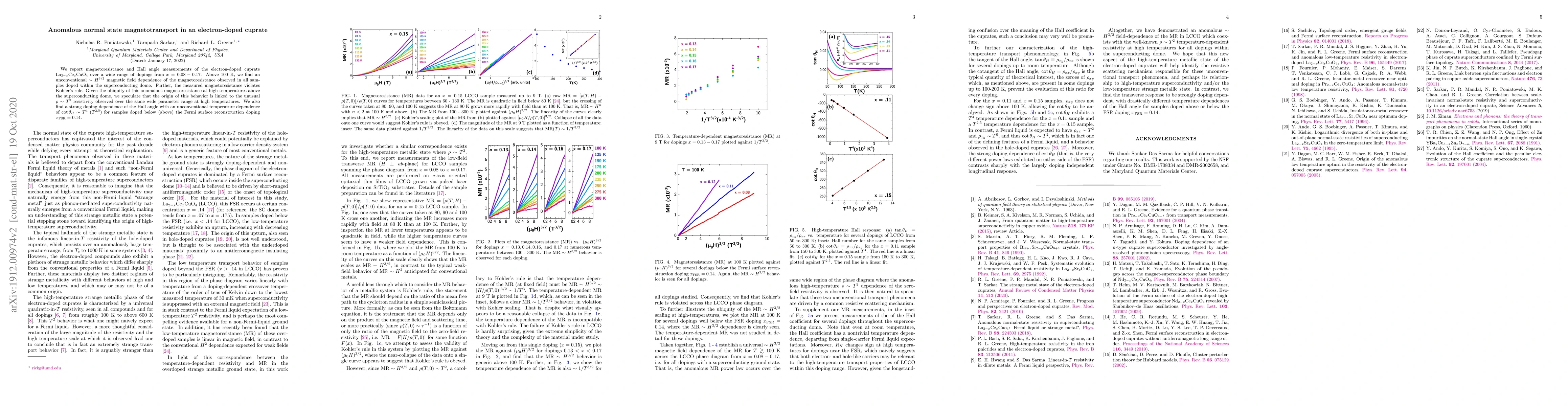 We report magnetoresistance and Hall angle measurements of the electron-doped cuprate La$_{2-x}$Ce$_x$CuO$_4$ over a wide range of dopings from $x = 0.08 - 0.17$. Above 100 K, we find an unconventional $\sim H^{3/2}$ magnetic field dependence of the magnetoresistance observed in all samples doped within the superconducting dome. Further, the measured magnetoresistance violates Kohler's rule. Given the ubiquity of this anomalous magnetoresistance at high temperatures above the superconducting dome, we speculate that the origin of this behavior is linked to the unusual $\rho \sim T^2$ resistivity observed over the same wide parameter range at high temperatures. We also find a strong doping dependence of the Hall angle with an unconventional temperature dependence of $\cot \theta_H \sim T^{4}$ ($T^{2.5}$) for samples doped below (above) the Fermi surface reconstruction doping $x_{\text{FSR}} = 0.14$.