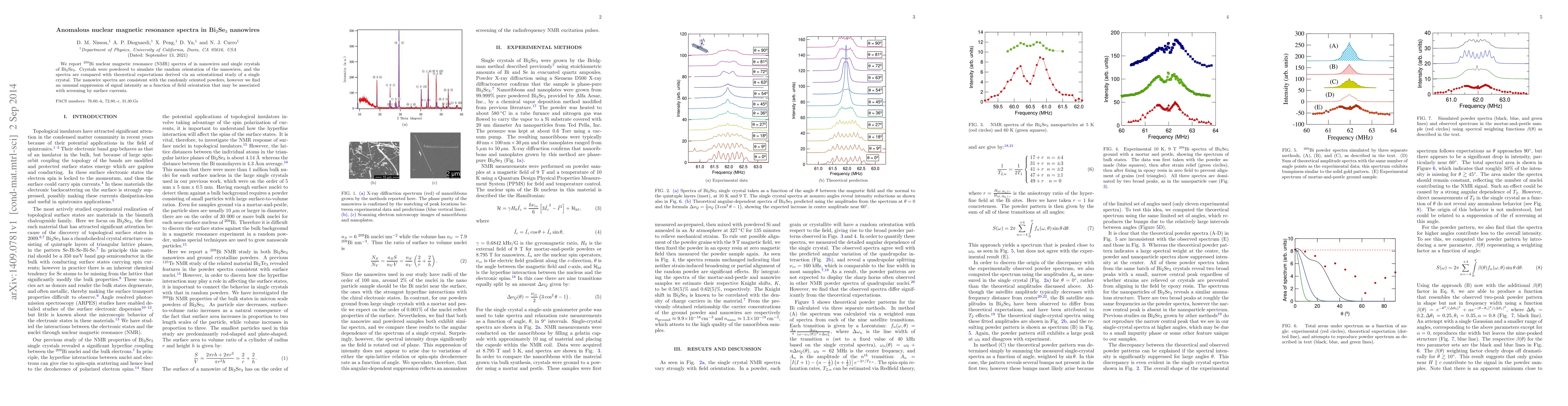 Summary: $^{209}$Bi NMR spectra of Bi$_2$Se$_3$ nanowires and powdered single crystals show similar orientations, but an unexpected suppression in signal intensity is observed, potentially linked to surface current screening effects.