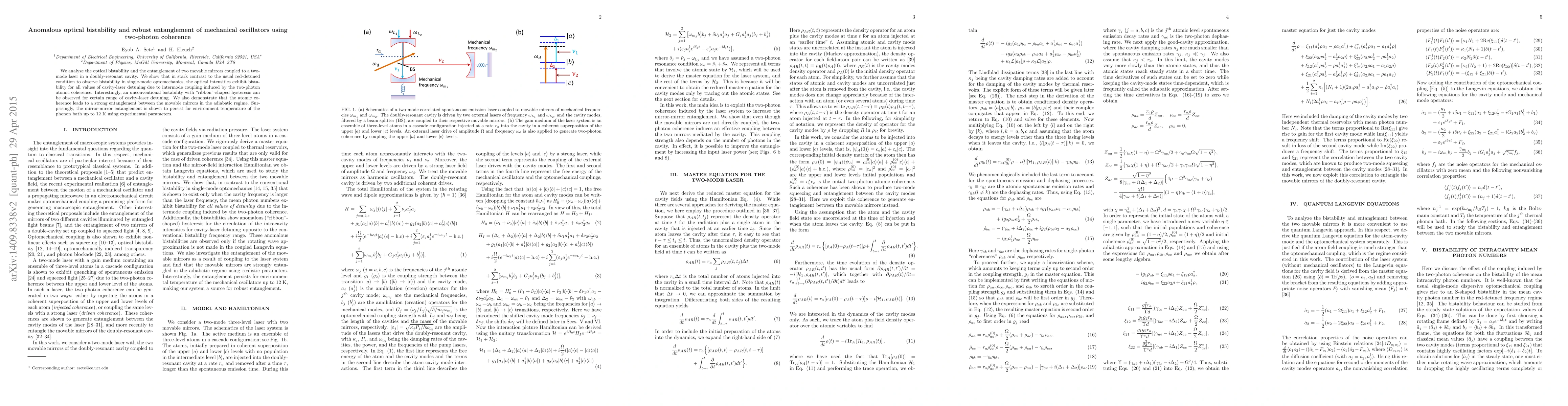 This paper demonstrates optical bistability across all cavity-laser detuning values due to two-photon coherence in optomechanics, contrasting typical red-detuned conditions. It also reveals robust entanglement between mechanical oscillators in the adiabatic regime, which persists at temperatures up to 12 K.
