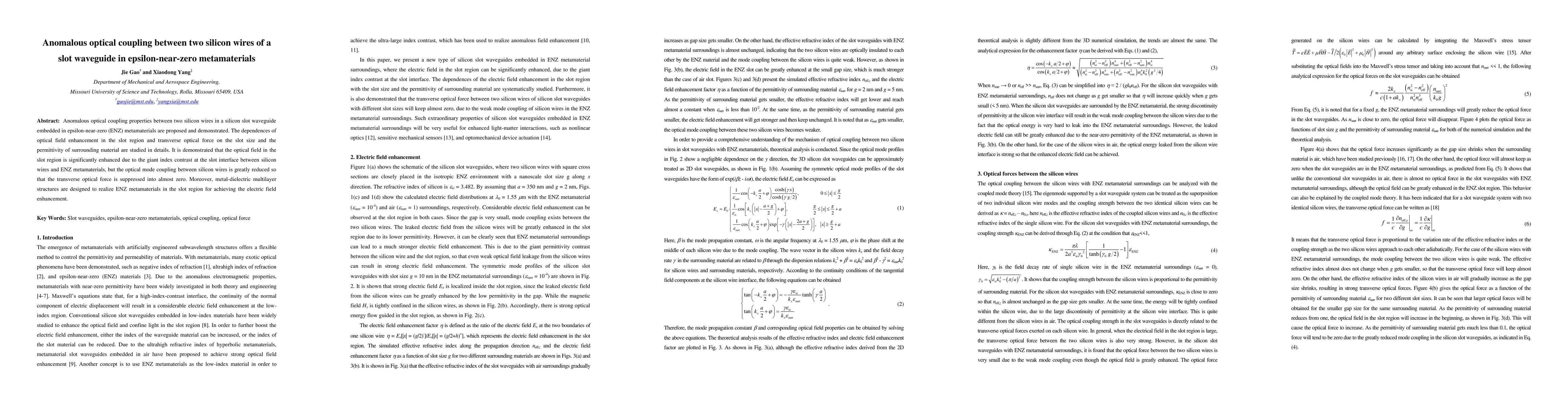 This research proposes and demonstrates anomalous optical coupling between two silicon wires in a slot waveguide embedded in epsilon-near-zero metamaterials, showing significant optical field enhancement and nearly zero transverse optical force due to the giant index contrast at the slot interface. Metal-dielectric multilayers are used to achieve the desired ENZ properties.