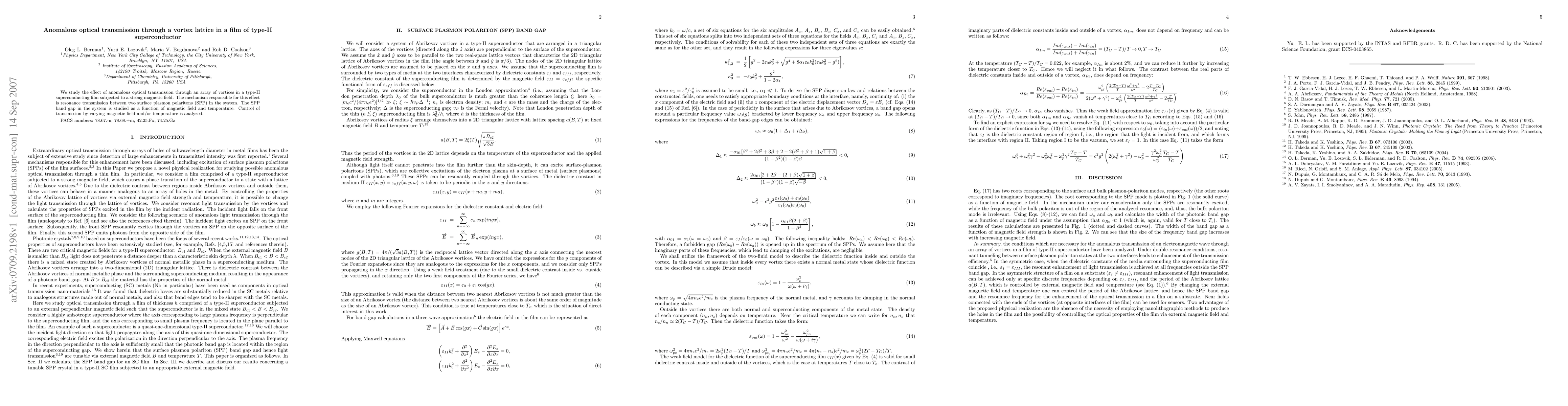 This study investigates anomalous optical transmission through a vortex lattice in a type-II superconductor, attributing the phenomenon to resonance transmission between surface plasmon polaritons. The SPP band gap is analyzed under varying magnetic field and temperature, revealing controllable transmission effects.