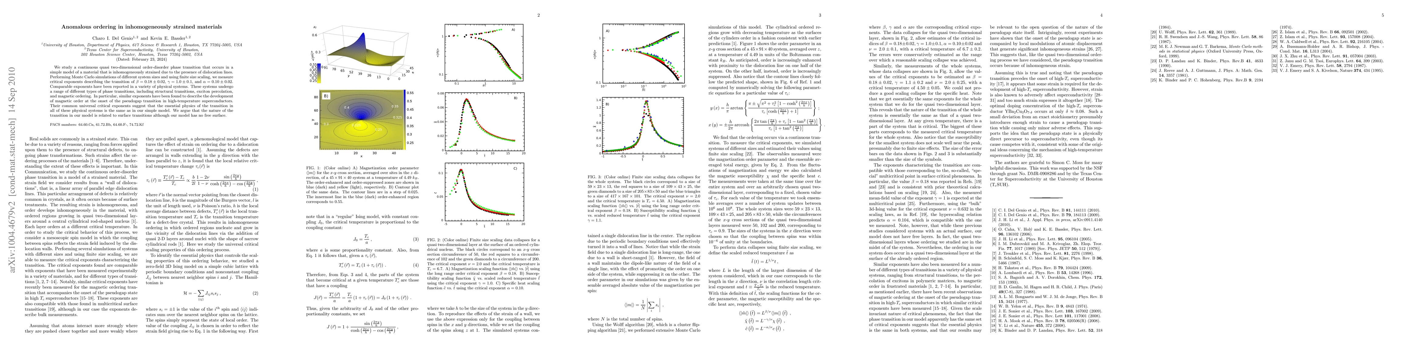We study a continuous quasi-two-dimensional order-disorder phase transition that occurs in a simple model of a material that is inhomogeneously strained due to the presence of dislocation lines. Performing Monte Carlo simulations of different system sizes and using finite size scaling, we measure critical exponents describing the transition of beta=0.18\pm0.02, gamma=1.0\pm0.1, and alpha=0.10\pm0.02. Comparable exponents have been reported in a variety of physical systems. These systems undergo a range of different types of phase transitions, including structural transitions, exciton percolation, and magnetic ordering. In particular, similar exponents have been found to describe the development of magnetic order at the onset of the pseudogap transition in high-temperature superconductors. Their common universal critical exponents suggest that the essential physics of the transition in all of these physical systems is the same as in our model. We argue that the nature of the transition in our model is related to surface transitions, although our model has no free surface.