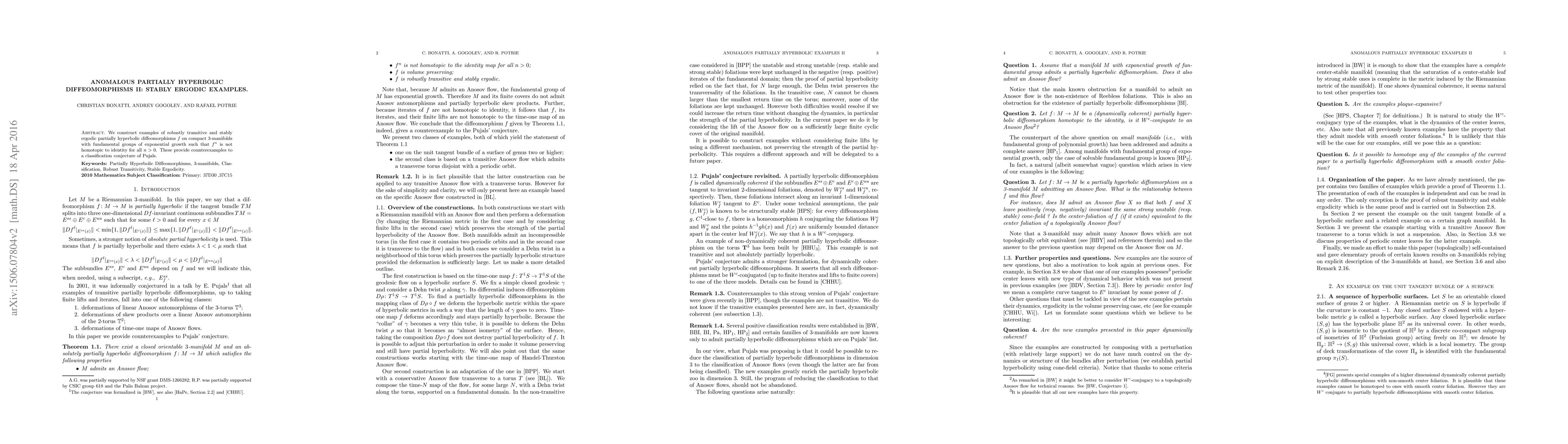 Summary: This paper constructs robustly transitive and stably ergodic partially hyperbolic diffeomorphisms on compact 3-manifolds with exponential growth fundamental groups, demonstrating that $f^n$ is not homotopic to the identity for all $n>0$, thus refuting a classification conjecture by Pujals.