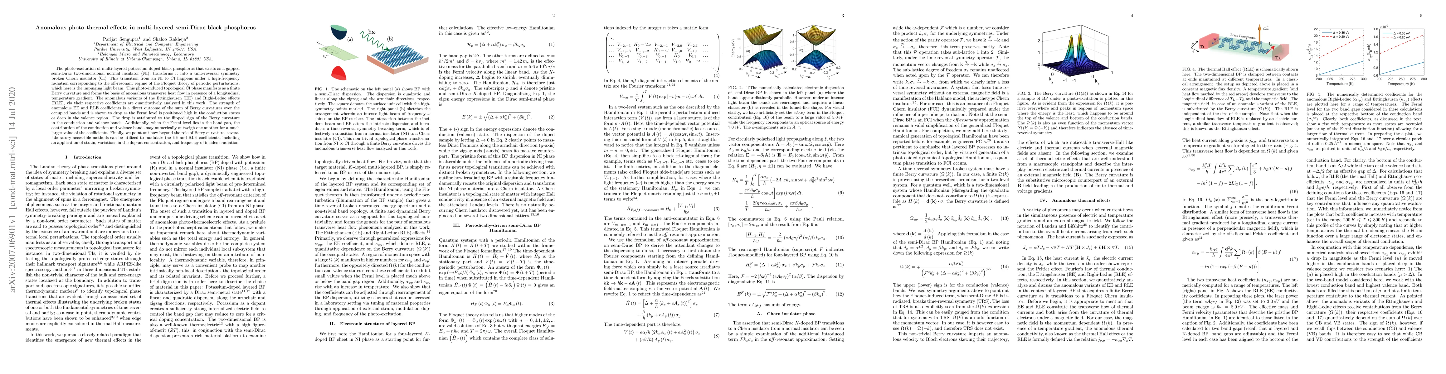 The photo-excitation of multi-layered potassium doped black phosphorus that exists as a gapped semi-Dirac two-dimensional normal insulator (NI), transforms it into a time-reversal symmetry broken Chern insulator (CI). This transition from an NI to CI happens under a high-frequency radiation corresponding to the off-resonant regime of the Floquet theory of periodic perturbations, which here is the impinging light beam. This photo-induced topological CI phase manifests as a finite Berry curvature and forms the basis of anomalous transverse heat flow in presence of a longitudinal temperature gradient. The anomalous variants of the Ettinghausen (EE) and Righi-Leduc effects (RLE), via their respective coefficients are quantitatively analyzed in this work. The strength of anomalous EE and RLE coefficients is a direct outcome of the sum of Berry curvatures over the occupied bands and is shown to drop as the Fermi level is positioned high in the conduction states or deep in the valence region. The drop is attributed to the flipped sign of the Berry curvature in the conduction and valence bands. Additionally, when the Fermi level lies in the band gap, the contribution of the conduction and valence bands may numerically outweigh one another for a much larger value of the coefficients. Finally, we point out how beyond the role of Berry curvature, several laboratory accessible methods can be utilized to modulate the EE and RLE coefficients, including an application of strain, variations in the dopant concentration, and frequency of incident radiation.