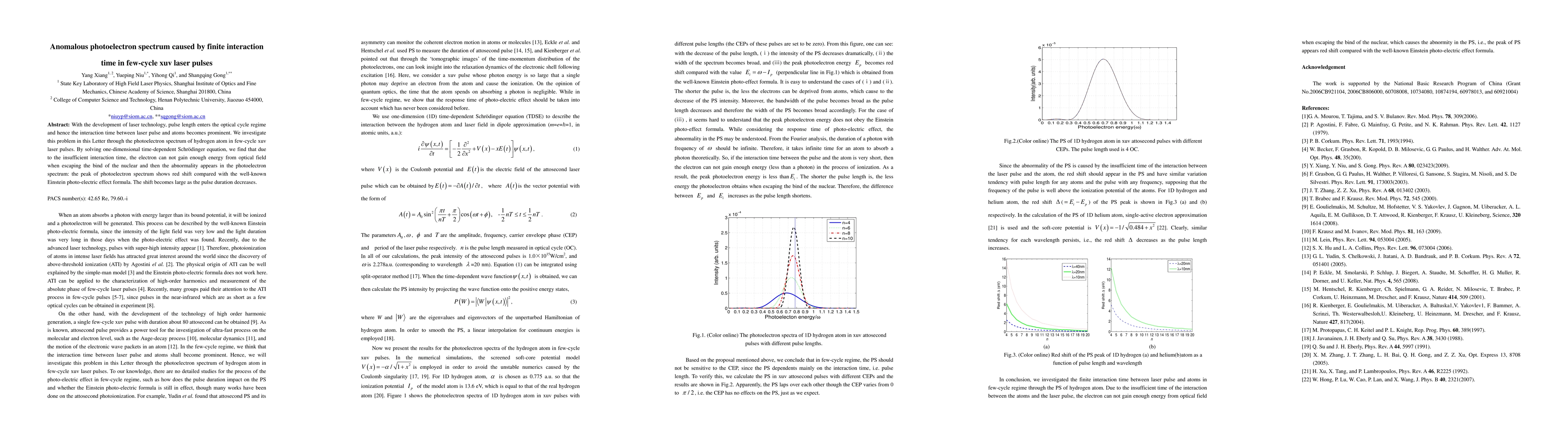 This paper explores the anomalous photoelectron spectrum in hydrogen atoms interacting with few-cycle xuv laser pulses, revealing a red shift in the peak due to insufficient interaction time. The study finds that the peak shift increases with decreasing pulse duration, deviating from the Einstein photo-electric effect formula.