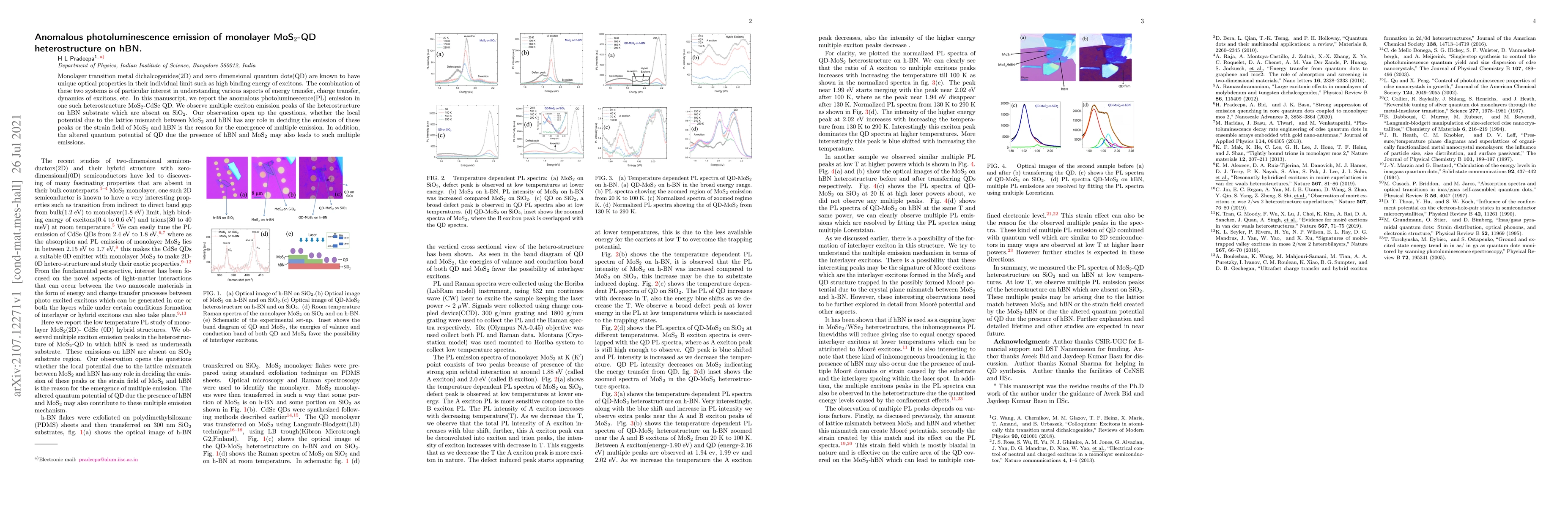 This paper investigates the anomalous photoluminescence emission in a heterostructure combining monolayer MoS2 and CdSe quantum dots on an hBN substrate, observing multiple exciton emission peaks absent on SiO2. The study raises questions about the role of lattice mismatch and strain fields between MoS2 and hBN in the observed emission phenomena.