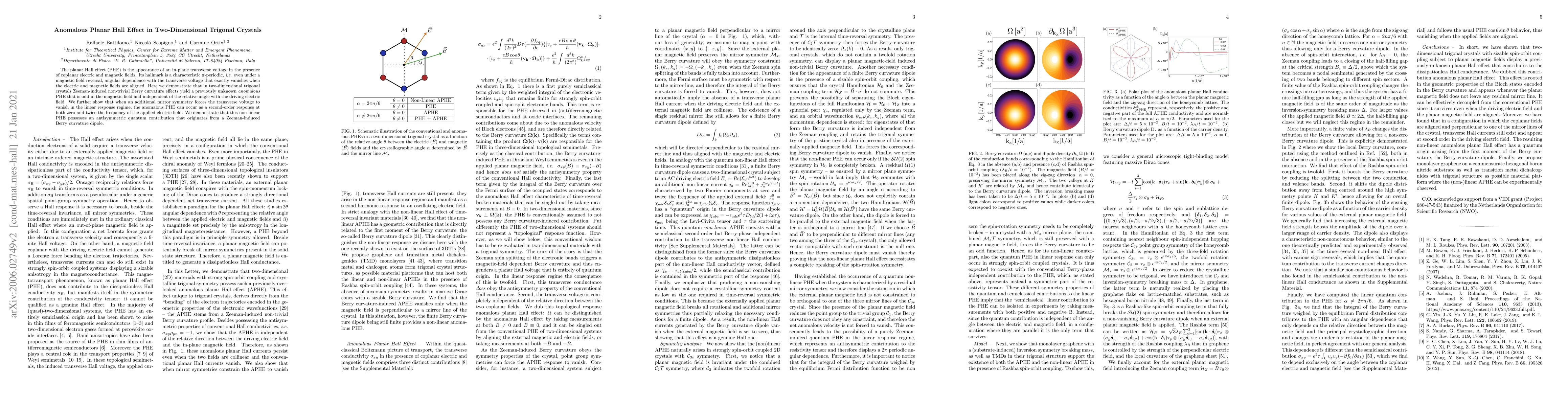 The research unveils an anomalous planar Hall effect in two-dimensional trigonal crystals, characterized by an odd magnetic field dependence and independence from electric field alignment, driven by Zeeman-induced non-trivial Berry curvature. This non-linear effect can appear as a second-order response, with an antisymmetric quantum contribution from a Zeeman-induced Berry curvature dipole.