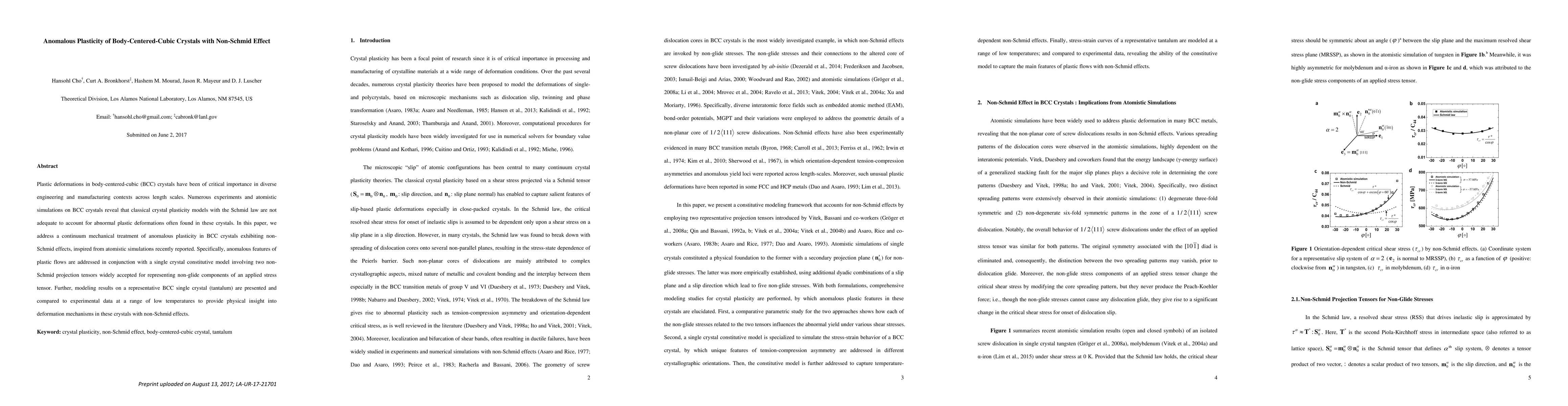 This paper investigates the anomalous plasticity in body-centered-cubic (BCC) crystals, proposing a continuum mechanical model that accounts for non-Schmid effects, and compares its predictions to experimental data on tantalum crystals at low temperatures. The model incorporates non-glide components of stress tensors to better represent plastic deformation mechanisms.