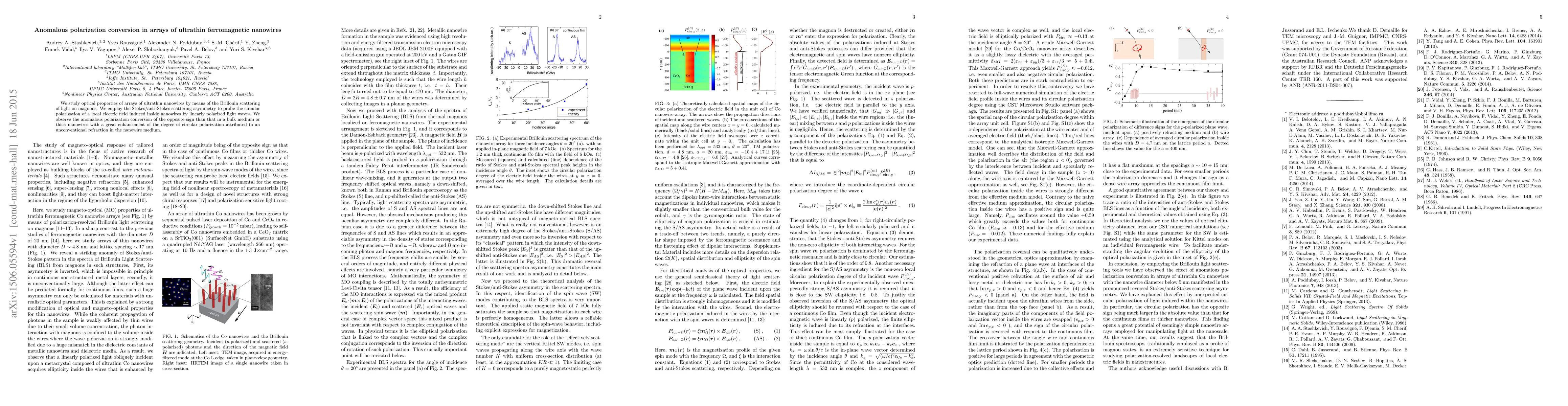 Summary: This study investigates the optical properties of ultrathin ferromagnetic nanowire arrays using Brillouin scattering, revealing anomalous polarization conversion with enhanced circular polarization due to unconventional refraction effects.